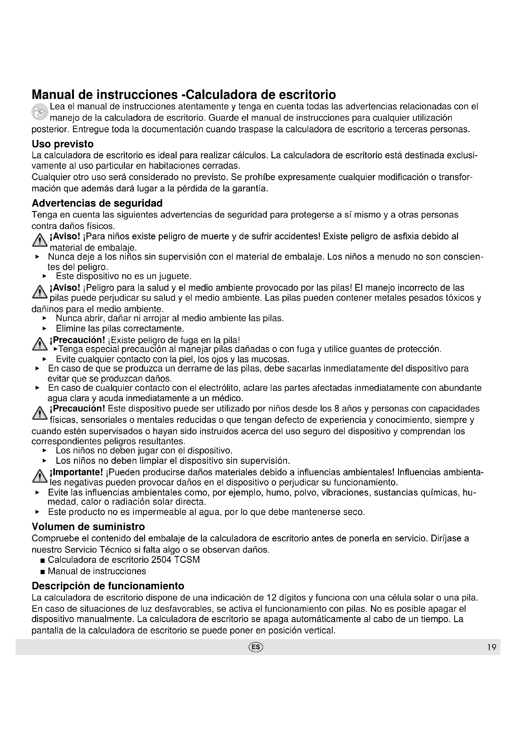 - Este producto no es impermeable al agua, por lo que debe mantenerse seco. Volumen de suministro Compruebe el contenido del embalaje de la calculadora de escritorio antes de ponerla en servicio. Diríjase a nuestro Servicio Técnico si falta algo o se observan daños. ■ Calculadora de escritorio 2504 TCSM ■ Manual de instrucciones Descripción de funcionamiento La calculadora de escritorio dispone de una indicación de 12 dígitos y funciona con una célula solar o una pila. En caso de situaciones de luz desfavorables, se activa el funcionamiento con pilas. No es posible apagar el dispositivo manualmente. La calculadora de escritorio se apaga automáticamente al cabo de un tiempo. La pantalla de la calculadora de escritorio se puede poner en posición vertical.20