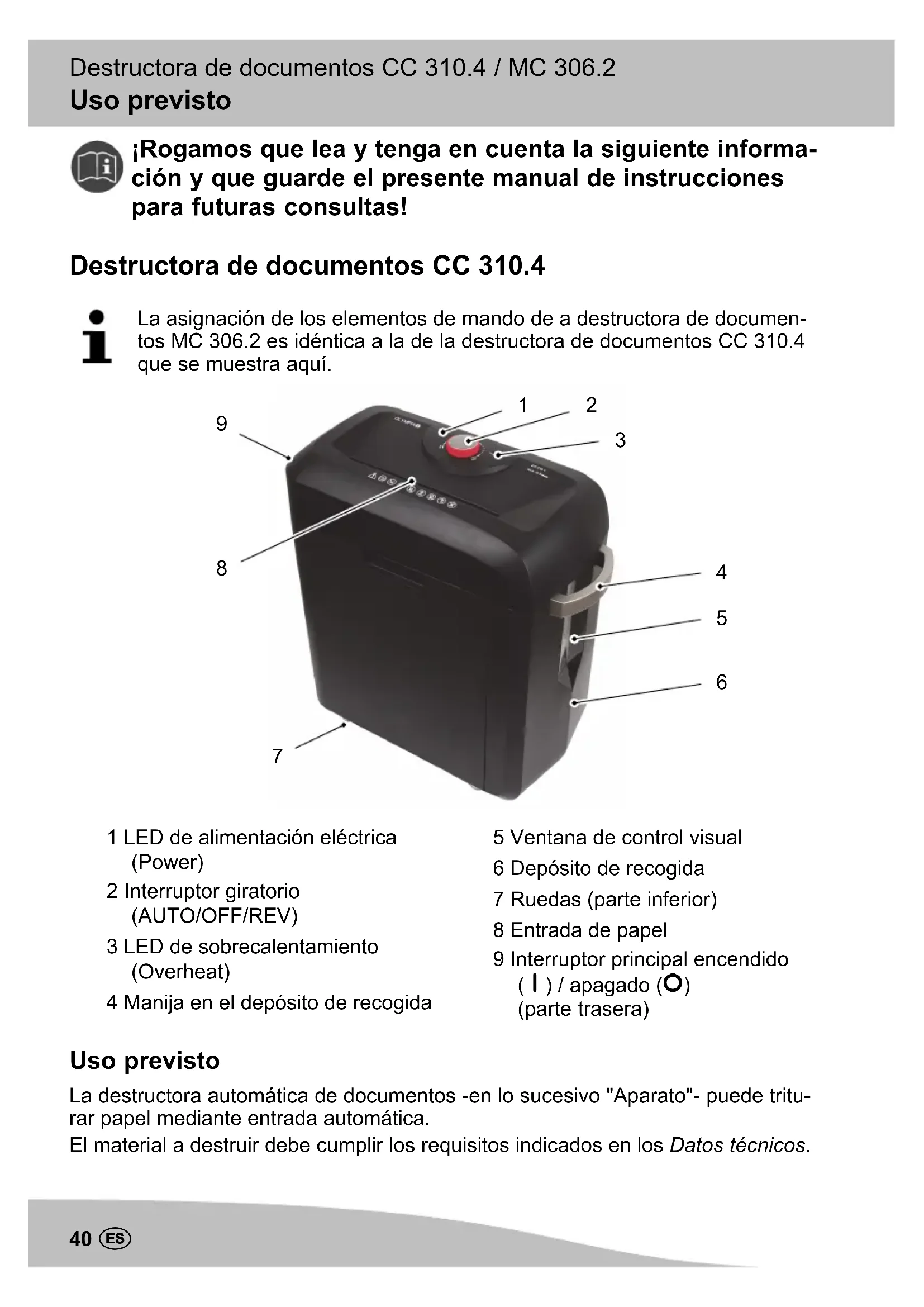 1 LED de alimentación eléctrica (Power) 2 Interruptor giratorio (AUTO/OFF/REV) 3 LED de sobrecalentamiento (Overheat) 4 Manija en el depósito de recogida 5 Ventana de control visual 6 Depósito de recogida 7 Ruedas (parte inferior) 8 Entrada de papel 9 Interruptor principal encendido (⏽) / apagado (⭘) (parte trasera) Uso previsto La destructora automática de documentos -en lo sucesivo "Aparato"- puede tritu rar papel mediante entrada automática. El material a destruir debe cumplir los requisitos indicados en los Datos técnicos.Advertencias de seguridad Destructora de documentos CC 310.4 / MC 306.2 41E Se prohíbe expresamente cualquier modificación o transformación del aparato por cuenta propia. Jamás abra el aparato y tampoco intente repararlo por su cuenta. Uso no conforme al objetivo previsto La destructora automática de documentos no sirve para triturar material que no cumpla los requisitos indicados en los Datos técnicos (por ejemplo, cartón). Cualquier otro uso diferente a la descripción en Uso previsto se considera como no conforme al objetivo previsto. Advertencias de seguridad Las siguientes advertencias de seguridad tienen validez para todo el documento. Lea y tenga en cuenta las advertencias de seguridad para protegerse a sí mismo y al medio ambiente.