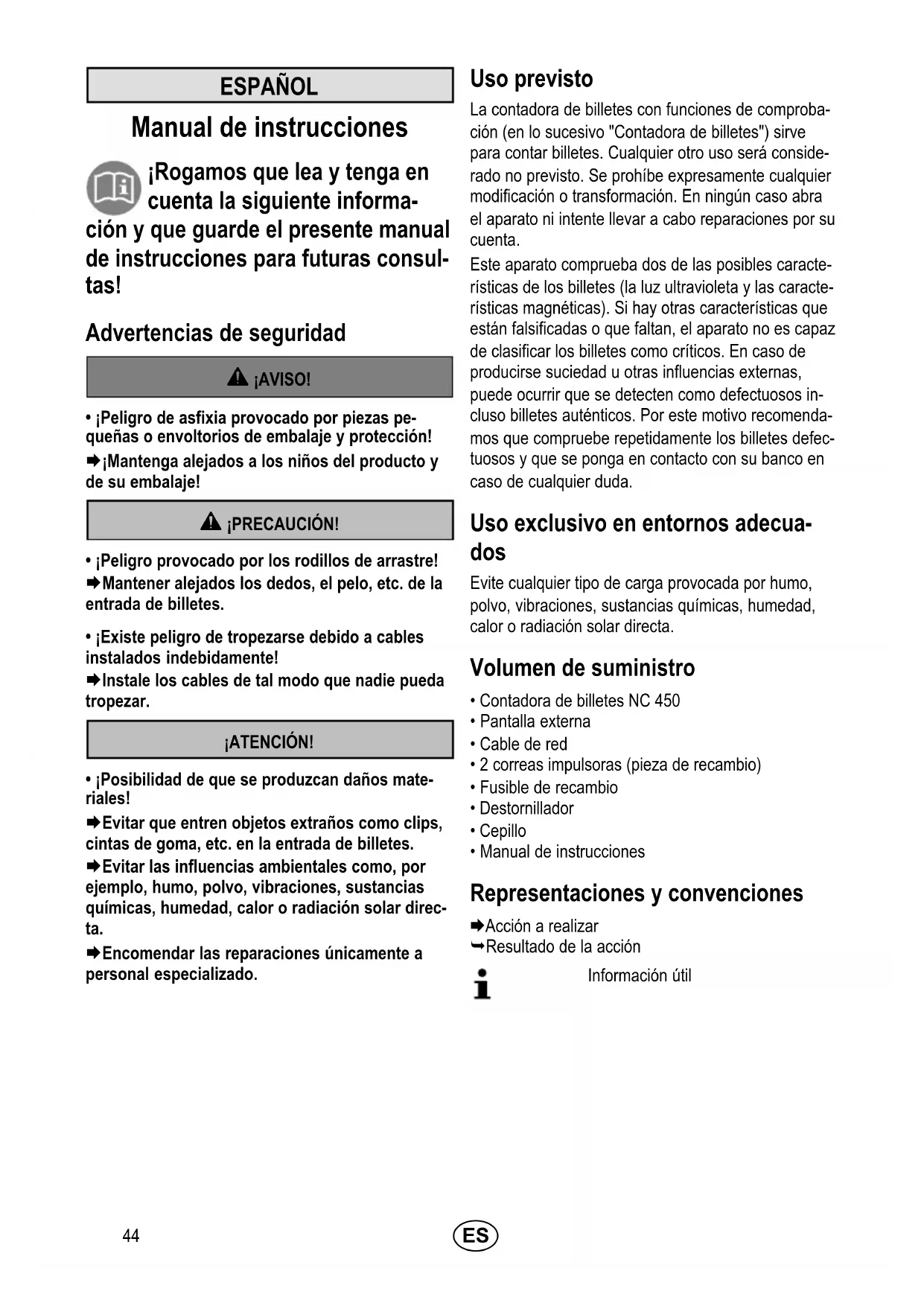- ¡Posibilidad de que se produzcan daños mate riales! Æ Evitar que entren objetos extraños como clips, cintas de goma, etc. en la entrada de billetes. Æ Evitar las influencias ambientales como, por ejemplo, humo, polvo, vibraciones, sustancias químicas, humedad, calor o radiación solar direc ta. Æ Encomendar las reparaciones únicamente a personal especializado. Uso previsto La contadora de billetes con funciones de comproba ción (en lo sucesivo "Contadora de billetes") sirve para contar billetes. Cualquier otro uso será conside rado no previsto. Se prohíbe expresamente cualquier modificación o transformación. En ningún caso abra el aparato ni intente llevar a cabo reparaciones por su cuenta. Este aparato comprueba dos de las posibles caracte rísticas de los billetes (la luz ultravioleta y las caracte rísticas magnéticas). Si hay otras características que están falsificadas o que faltan, el aparato no es capaz de clasificar los billetes como críticos. En caso de producirse suciedad u otras influencias externas, puede ocurrir que se detecten como defectuosos in cluso billetes auténticos. Por este motivo recomenda mos que compruebe repetidamente los billetes defec tuosos y que se ponga en contacto con su banco en caso de cualquier duda. Uso exclusivo en entornos adecua dos Evite cualquier tipo de carga provocada por humo, polvo, vibraciones, sustancias químicas, humedad, calor o radiación solar directa. Volumen de suministro