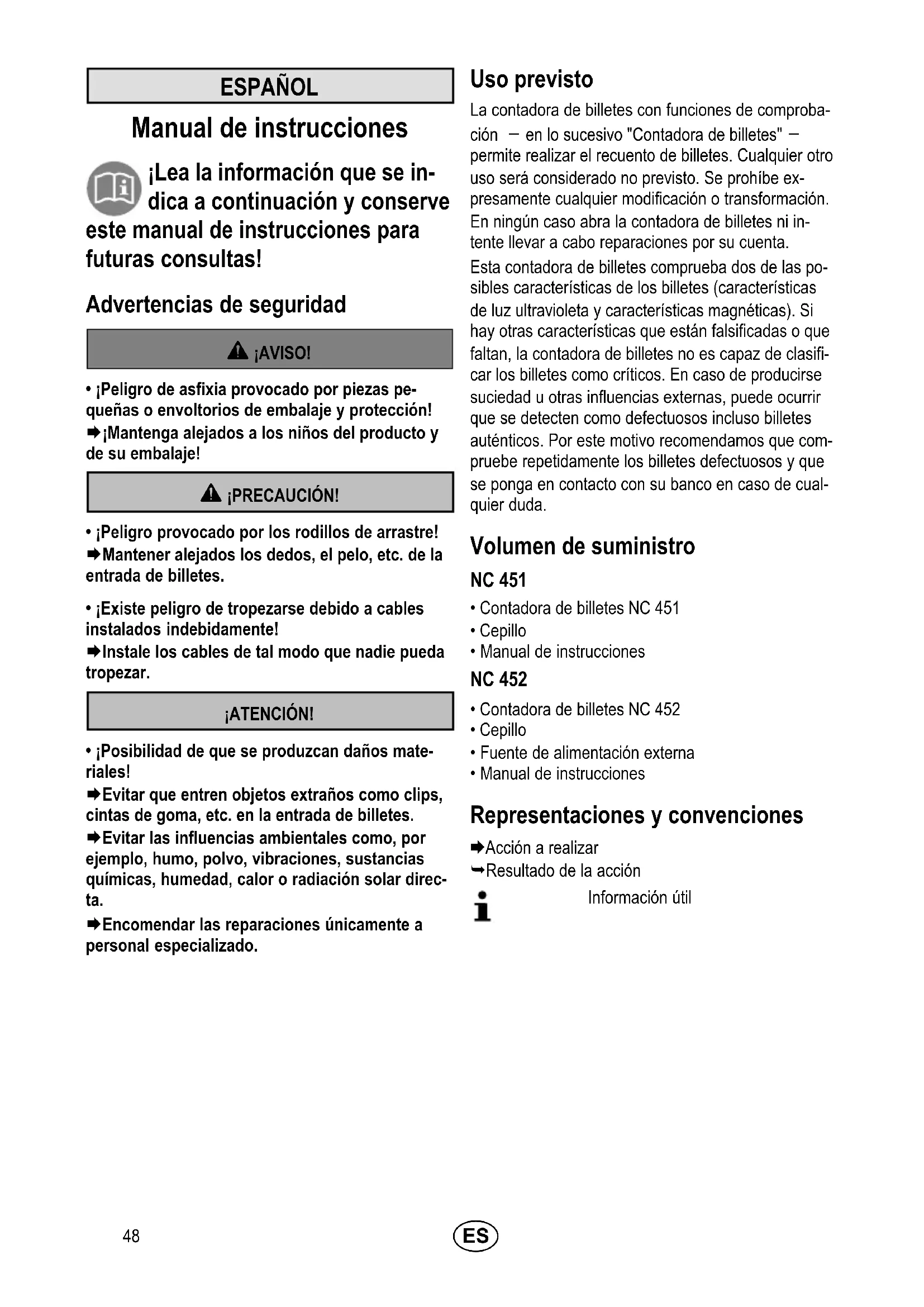 - ¡Posibilidad de que se produzcan daños mate riales! Æ Evitar que entren objetos extraños como clips, cintas de goma, etc. en la entrada de billetes. Æ Evitar las influencias ambientales como, por ejemplo, humo, polvo, vibraciones, sustancias químicas, humedad, calor o radiación solar direc ta. Æ Encomendar las reparaciones únicamente a personal especializado. Uso previsto La contadora de billetes con funciones de comproba ción – en lo sucesivo "Contadora de billetes" – permite realizar el recuento de billetes. Cualquier otro uso será considerado no previsto. Se prohíbe ex presamente cualquier modificación o transformación. En ningún caso abra la contadora de billetes ni in tente llevar a cabo reparaciones por su cuenta. Esta contadora de billetes comprueba dos de las po sibles características de los billetes (características de luz ultravioleta y características magnéticas). Si hay otras características que están falsificadas o que faltan, la contadora de billetes no es capaz de clasifi car los billetes como críticos. En caso de producirse suciedad u otras influencias externas, puede ocurrir que se detecten como defectuosos incluso billetes auténticos. Por este motivo recomendamos que com pruebe repetidamente los billetes defectuosos y que se ponga en contacto con su banco en caso de cual quier duda. Volumen de suministro NC 451