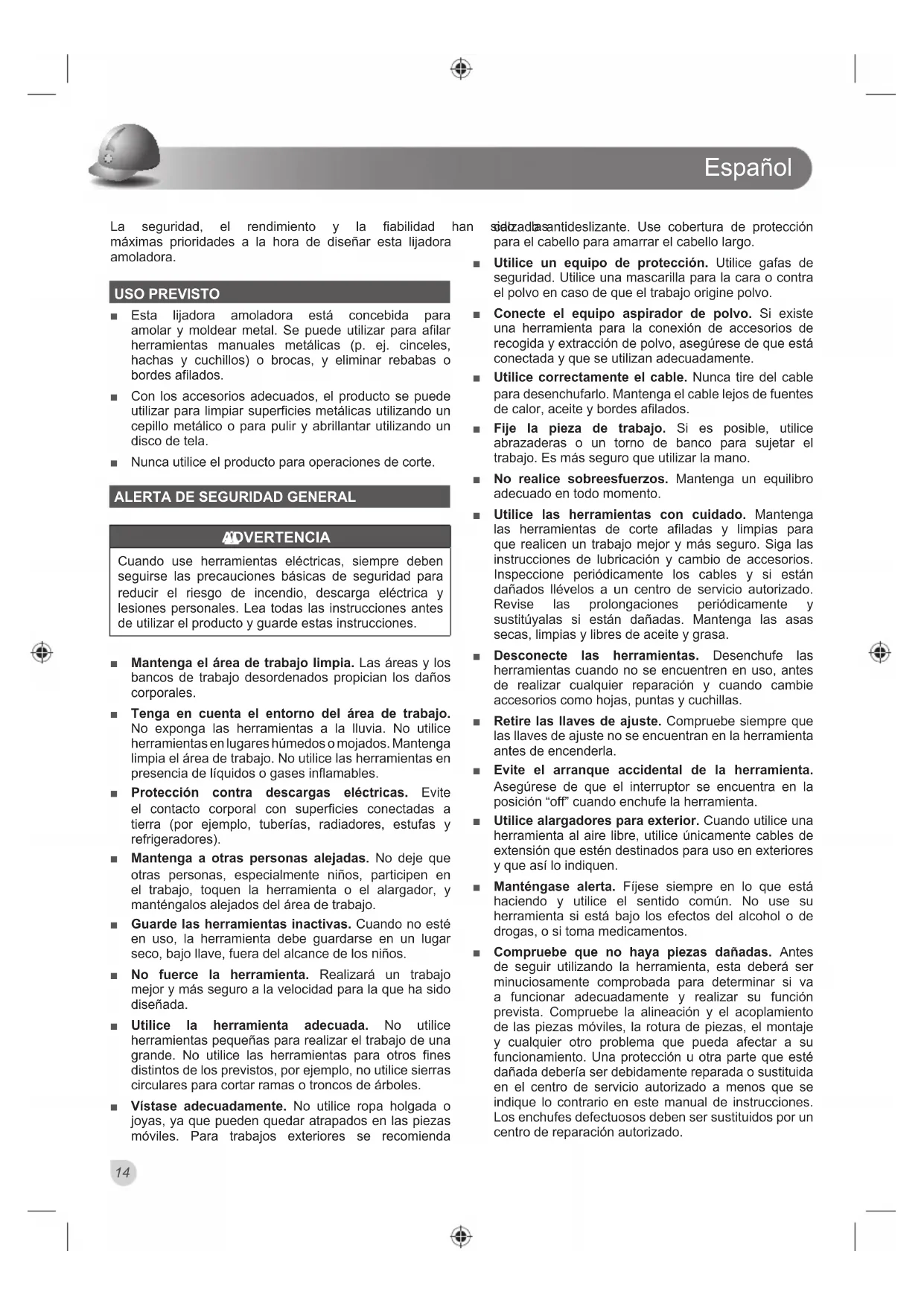 LIJADORA AMOLADORA Ŷ El enchufe debe estar conectado a la toma correspondiente que está instalada adecuadamente y que se una toma de tierra según todos los códigos y ordenanzas locales. Si no está seguro, solicite a un electricista certificado que revise el receptáculo. Ŷ Monte el producto firmemente en el banco de trabajo, el soporte de molienda u otra estructura rígida antes de ponerlo en funcionamiento. Un producto sin fijar es inestable y puede desplazarse durante el funcionamiento. Esto puede provocar daños o lesiones. Ŷ Proporcione una iluminación general y localizada adecuada a fin de evitar efectos estroboscópicos y otros peligros. Ŷ Antes de ponerlo en marcha, inspeccione los componentes y los accesorios del producto para garantizar que no haya condiciones que puedan afectar su correcto funcionamiento. Apriete las tuercas de bloqueo de la muela, los pernos de fijación y todas las abrazaderas y protectores. Ŷ Antes de cada puesta en marcha, inspeccione la muela en busca de daños. No utilice muelas dañadas o deformes. Sustituya las muelas dañadas de conformidad con las instrucciones. Ŷ Verifique que la muela rota libremente antes de cada puesta en marcha. Con el producto desconectado y el interruptor en OFF, haga girar la muela con la mano. La muela no debe entrar en contacto con ningún componente de la amoladora de banco y no debe haber ninguna unión ni otras condiciones que puedan afectar el correcto funcionamiento. Ŷ Durante cada puesta en marcha, permanezca a un lado de la máquina y accione el interruptor ON. Deje que la amoladora funcione a su máxima velocidad durante un minuto para que aparezcan defectos o grietas no detectados. No ponga en contacto la muela con la pieza de trabajo hasta que el producto haya alcanzado su máxima velocidad. Ŷ Mantenga las manos y las partes del cuerpo alejadas de las muelas. Entrar en contacto con la muela giratoria puede causar lesiones. Ŷ Utilice siempre protectores y viseras protectoras. Mantenga las protecciones en su lugar y en perfecto estado. Utilizar el producto sin protectores o con protectores dañados puede provocar lesiones. Ŷ Evite quemaduras. La molienda puede provocar que los componentes y la muela se calienten. No toque la muela ni los componentes que puedan estar calientes. Ŷ No utilice el producto para trabajar con componentes pequeños o componentes que no se puedan sostener correctamente. El componente puede salir proyectado y provocar lesiones. Ŷ No amuele nunca en el lateral de la muela. La muela se desmenuzará. Amuele únicamente en la cara de la muela. Ŷ Nunca deje desatendida una herramienta en funcionamiento. Apague la herramienta. Atención, la muela sigue girando por inercia después de que se pare la herramienta. No suelte la herramienta hasta que se detenga por completo. Ŷ Nunca alcance detrás o debajo de las muelas. Ŷ Utilice protectores auditivos, como tapones u orejeras, durante periodos prolongados de uso. Ŷ Desenchufe la herramienta antes de realizar cualquier ajuste, reparación o tarea de mantenimiento. El cable de alimentación debe permanecer desconectado siempre que realice trabajos de mantenimiento en el producto. Ŷ Ajuste los soportes de herramientas cuando sea necesario para mantener la menor distancia posible entre los soportes de trabajo y las muelas. Esta distancia debe ser inferior o igual a 2 mm. Como el diámetro de la muela disminuye con el uso, mantenga la distancia máxima de soporte de la herramienta ajustándola. Ŷ Ajuste los protectores de chispas cuando sea necesario para mantener la menor distancia posible entre los soportes de trabajo y las muelas. Esta distancia debe ser inferior o igual a 2 mm. Como el diámetro de la muela disminuye con el uso, mantenga la distancia máxima de los protectores de chispas ajustándola. Ŷ Si el soporte de trabajo se desgasta o daña, sustitúyalo por una pieza de recambio idéntica de un centro de servicio autorizado. Ŷ Cuando coloque una nueva muela, compruebe siempre que las RPM máximas indicadas alcanzan o superan las indicadas en el producto. Asegúrese de que el diámetro de la muela y el tamaño del árbol cumplen lo establecido en las indicaciones. También debe verificar la nueva muela en busca de daños, como defectos o grietas.Español