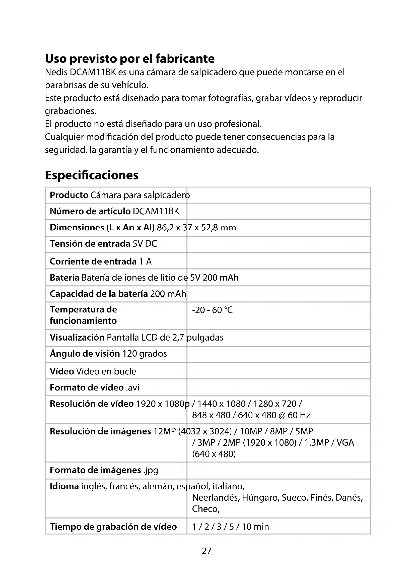 Guía de inicio rápido Cámara para salpicadero DCAM11BK Para más información, consulte el manual ampliado en línea: ned.is/dcam11bk27 Uso previsto por el fabricante Nedis DCAM11BK es una cámara de salpicadero que puede montarse en el parabrisas de su vehículo. Este producto está diseñado para tomar fotografías, grabar vídeos y reproducir grabaciones. El producto no está diseñado para un uso profesional. Cualquier modicación del producto puede tener consecuencias para la seguridad, la garantía y el funcionamiento adecuado. Especicaciones Producto Cámara para salpicadero Número de artículo DCAM11BK Dimensiones (L x An x Al) 86,2 x 37 x 52,8 mm Tensión de entrada 5V DC Corriente de entrada 1 A Batería Batería de iones de litio de 5V 200 mAh Capacidad de la batería 200 mAh Temperatura de funcionamiento -20 - 60 °C Visualización Pantalla LCD de 2,7 pulgadas Ángulo de visión 120 grados Vídeo Vídeo en bucle Formato de vídeo .avi Resolución de vídeo 1920 x 1080p / 1440 x 1080 / 1280 x 720 / 848 x 480 / 640 x 480 @ 60 Hz Resolución de imágenes 12MP (4032 x 3024) / 10MP / 8MP / 5MP / 3MP / 2MP (1920 x 1080) / 1.3MP / VGA (640 x 480) Formato de imágenes .jpg Idioma inglés, francés, alemán, español, italiano, Neerlandés, Húngaro, Sueco, Finés, Danés, Checo, Tiempo de grabación de vídeo 1 / 2 / 3 / 5 / 10 min28 Grabar audio Micrófono y altavoz incorporados. El micrófono se puede encender o apagar Tarjeta de memoria Tarjeta microSD Capacidad de la tarjeta de memoria