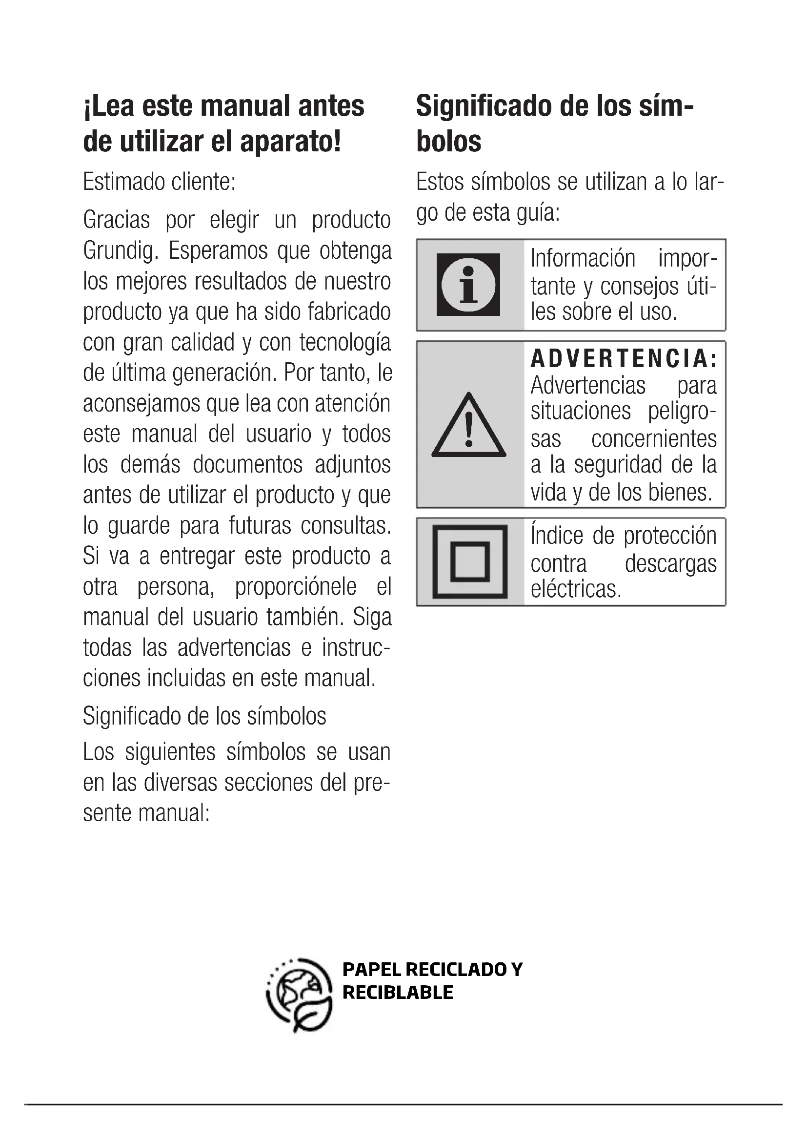 GARANTİ BELGESİ¡Lea este manual antes de utilizar el aparato! Estimado cliente: Gracias por elegir un producto Grundig. Esperamos que obtenga los mejores resultados de nuestro producto ya que ha sido fabricado con gran calidad y con tecnología de última generación. Por tanto, le aconsejamos que lea con atención este manual del usuario y todos los demás documentos adjuntos antes de utilizar el producto y que lo guarde para futuras consultas. Si va a entregar este producto a otra persona, proporciónele el manual del usuario también. Siga todas las advertencias e instruc- ciones incluidas en este manual. Significado de los símbolos Los siguientes símbolos se usan en las diversas secciones del pre- sente manual: Significado de los sím- bolos Estos símbolos se utilizan a lo lar- go de esta guía: