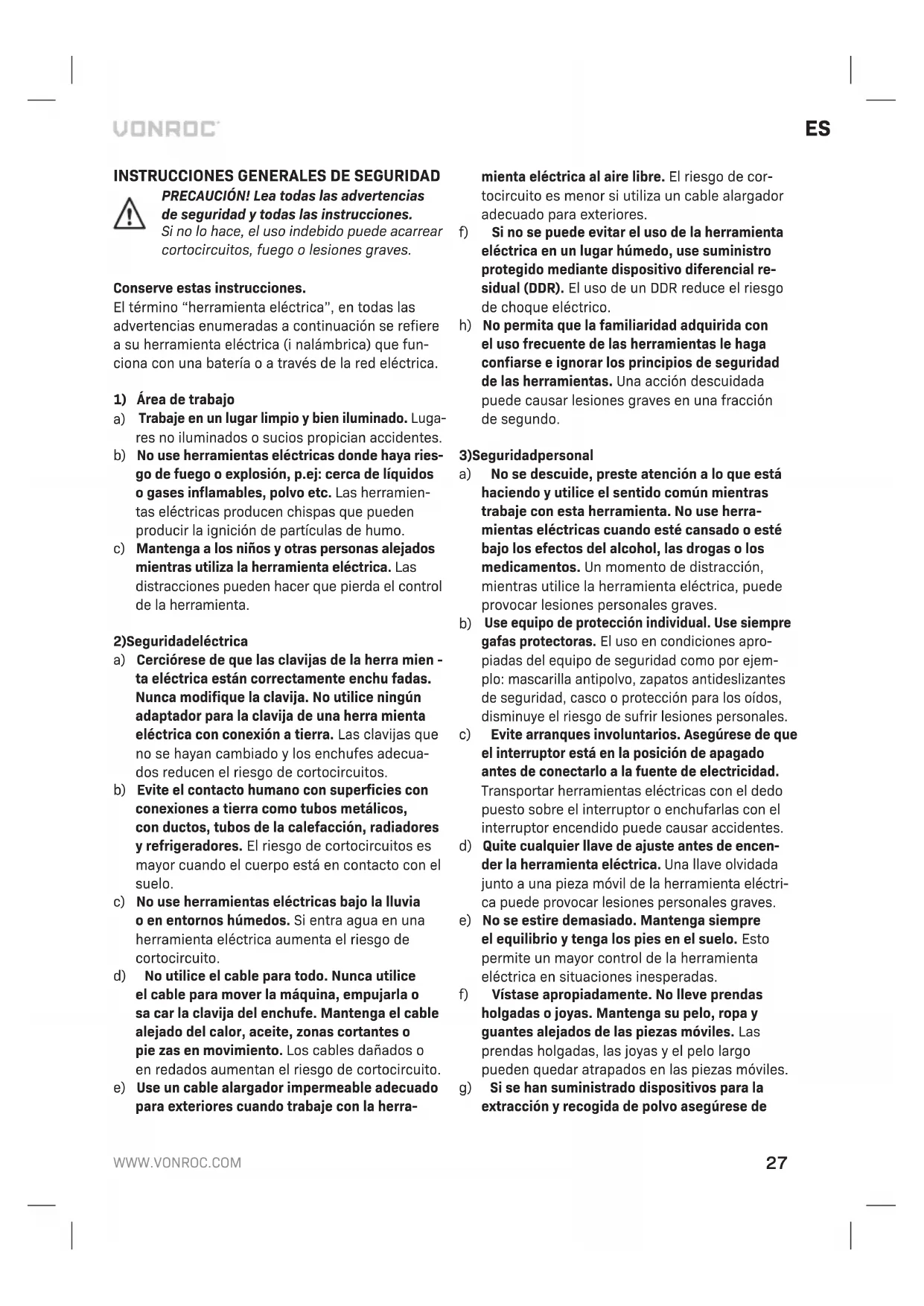 - Si se han utilizado piezas de repuesto no origi- nales. La presente constituye la única garantía implícita y explícita que ofrece la compañía. No existen otras garantías explícitas o implícitas que excedan las citadas aquí, incluidas las garantías implícitas de comerciabilidad e idoneidad para una finalidad en especial. VONROC no será considerada responsable en ningún caso por daños incidentales o consecuen- tes. Los recursos a disposición de los distribuidores se limitan a la reparación o a la sustitución de las unidades o piezas no conformes. El producto y el manual de usuario están sujetos a variaciones. Las especificaciones pueden variarse sin previo aviso.32