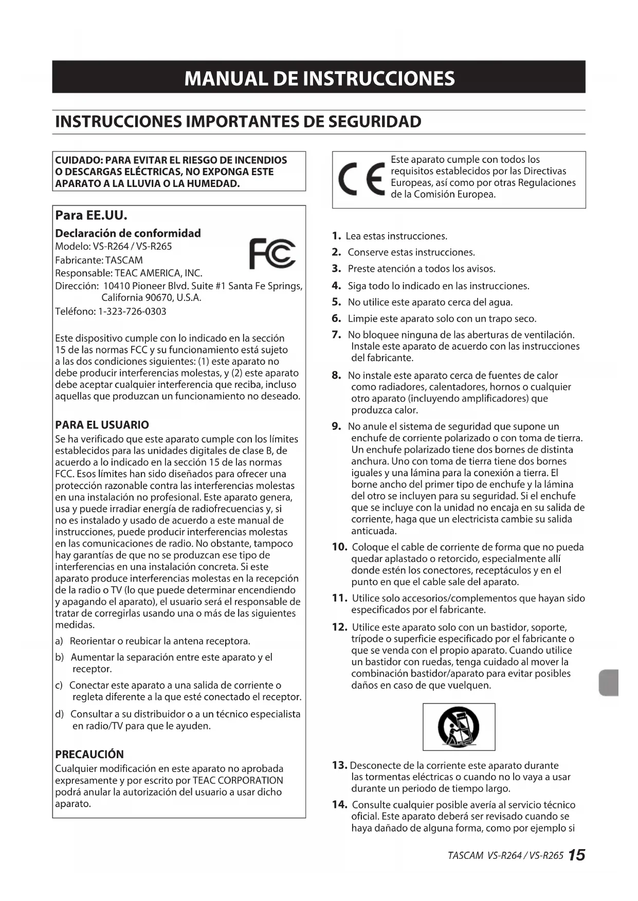CUIDADO: PARA EVITAR EL RIESGO DE INCENDIOS O DESCARGAS ELÉCTRICAS, NO EXPONGA ESTE APARATO A LA LLUVIA O LA HUMEDAD. Para EE.UU. Declaración de conformidad Modelo: VS-R264 / VS-R265Fabricante: TASCAMResponsable: TEAC AMERICA, INC.Dirección: 10410 Pioneer Blvd. Suite #1 Santa Fe Springs, California 90670, U.S.A.Teléfono: 1-323-726-0303Este dispositivo cumple con lo indicado en la sección 15 de las normas FCC y su funcionamiento está sujeto a las dos condiciones siguientes: (1) este aparato no debe producir interferencias molestas, y (2) este aparato debe aceptar cualquier interferencia que reciba, incluso aquellas que produzcan un funcionamiento no deseado.