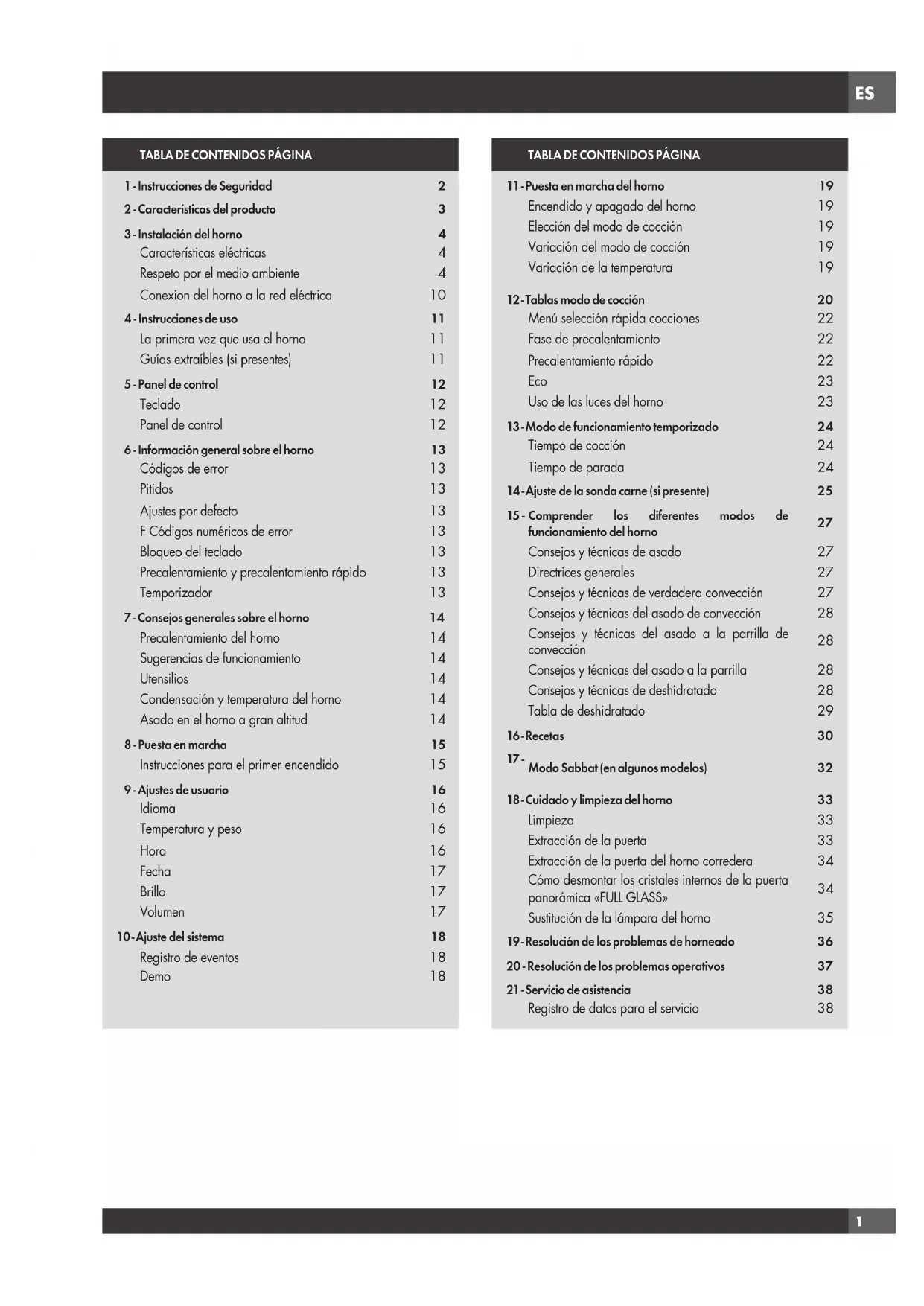 Antes de llamar al servicio verifique los siguientes puntos para evitar sobrecargarlo de forma innecesaria. Problema del horno Pasos para resolver el problema En la ventana aparece otro F_Error. Apague la corriente general y vuelva a encenderla pasados unos segundos. Si la condición persiste anote el número de código (en la lista REGISTRO EVENTO) y póngase en contacto con el servicio. El display del horno permanece en OFF Apague la corriente general (caja de fusibles o cortocircuito). Encienda el disyuntor. Si la condición persiste llame al servicio de asistencia autorizado. El ventilador de enfriamiento sigue funcionando después de haberlo apagado. El ventilador se apaga automáticamente cuando todos los componentes electrónicos se han enfriado bastante. El horno no está calentando. Verifique el disyuntor de circuito o la caja de fusibles. Asegúrese de que el horno recibe una alimentación eléctrica adecuada. Asegúrese de que se ha seleccionado la temperatura del horno. El horno no cuece de manera uniforme Consulte las tablas del horno para averiguar cuál es la posición recomendada de la rejilla. Reducir siempre la temperatura de la receta 25°F (15°C) cuando se cuece en modo horneado convección. La luz del horno no funciona correctamente Cambie o vuelva a poner la bombilla si está floja o si es defectuosa. Consulte la página 35. Procure no tocar el cristal de la bombilla con los dedos, dado que la grasa de estos puede causar que la bombilla se queme prematuramente. La luz del horno se queda encendida Verifique si la puerta del horno está obstruida Verifique si la bisagra está doblada o si se ha roto el interruptor de la puerta. El reloj y el temporizador no funcionan adecuadamente Asegúrese de que el horno recibe una alimentación eléctrica adecuada. Consulte las secciones reloj en la página 16. Exceso de humedad Caliente previamente el horno cuando use el modo horneado. El horneado y el asado de convección eliminarán toda la humedad del horno (es una de las ventajas de la convección). Esquirlas de porcelana Cuando se sacan y se cambian las rejillas del horno tire siempre de estas hacia arriba sin forzarlas para evitar que la porcelana se desmenuce.ES