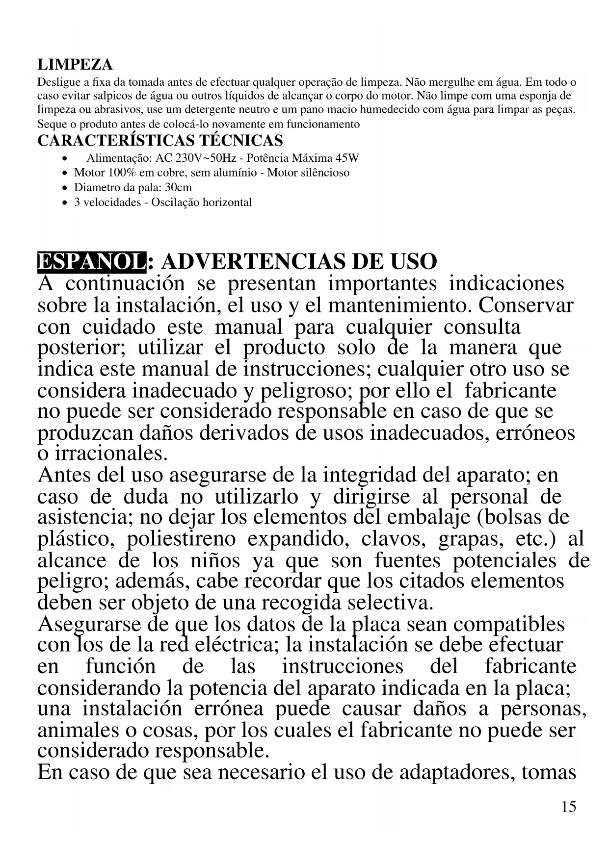 Realizar el montaje completo y siguiendo cuidadosamente las instrucciones de la sección "Instalación" No enchufar a la corriente si el montaje no esta terminado. No deje el aparato sin vigilancia mientras esté en funcionamiento. Desconecte el enchufe después de cada uso.. Para desenchufarlo, no tirar del cable de alimentacion No lo sumerja en agua u otros líquidos y evitar salpicaduras de líquidos.. Antes de realizar cualquer operacion de limpieza, desenchufar de la corriente18 Antes de cada uso enchufe el cable de alimentacion No introduzca ningún objeto en las rejillas de protección. No obstruya de ninguna manera las rejillas de la protección. Colocar en superficies sólidas y estables y lejos de ventanas o corrientes de aire.