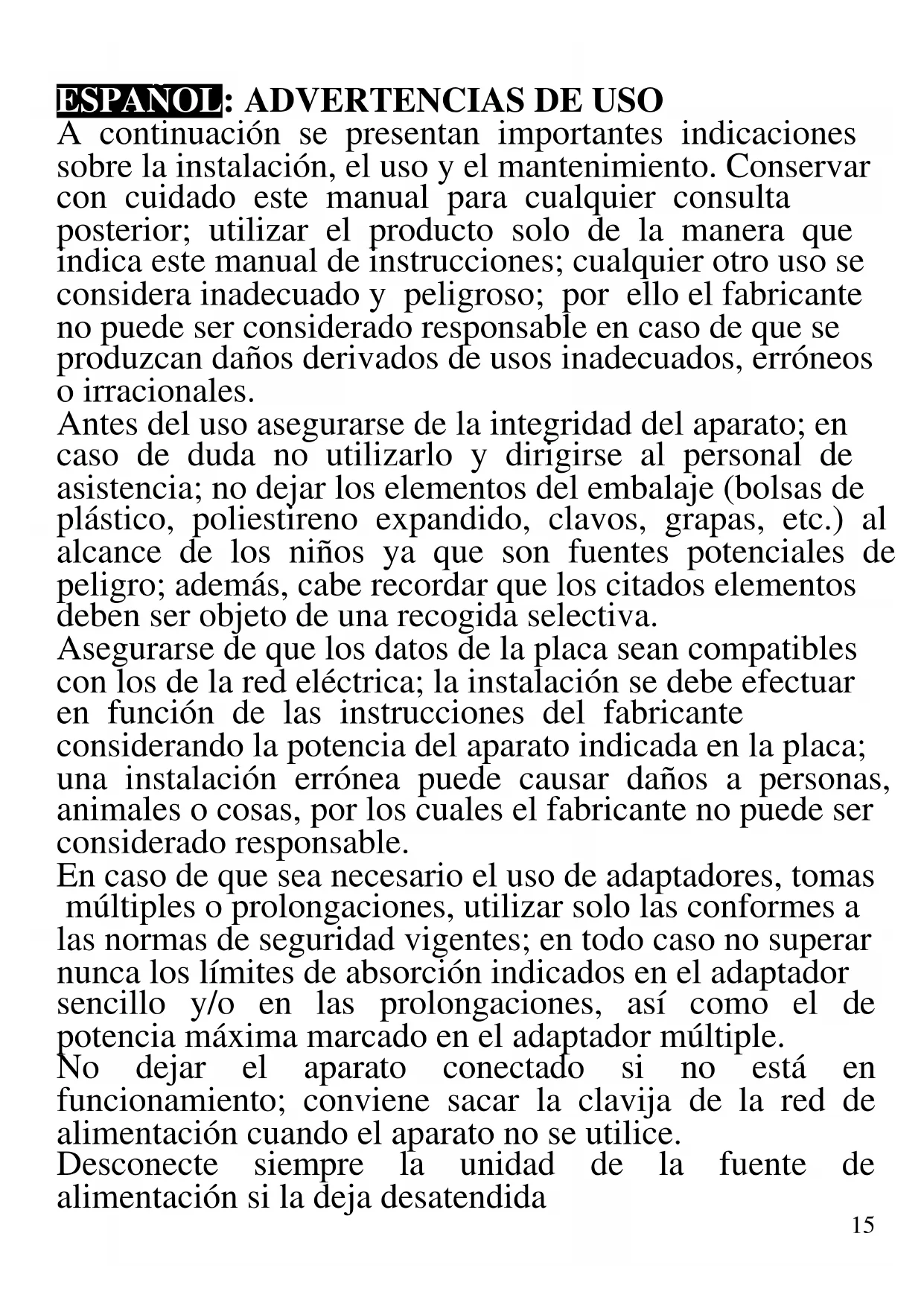 ESPAÑOL: ADVERTENCIAS DE USO