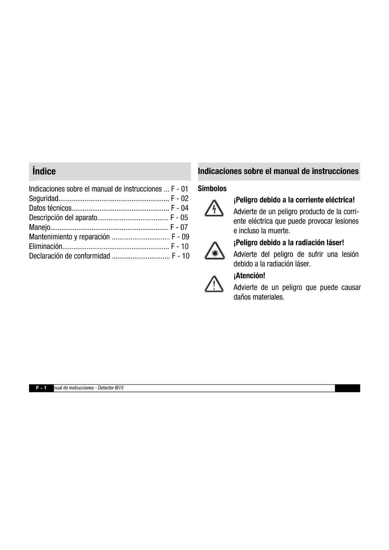 - haber leído y comprendido el manual de instruccio- nes y en especial el capítulo "Seguridad".ES Manual de instrucciones - Detector BI15 F - 4 Datos técnicos Modelo BI15 Peso 180 g Dimensiones A x A x P 180 x 67 x 38 mm Potencia del láser < 1 mW (630–670 nm) Clase láser ll Precisión láser 12,7 mm para 6,1 m Alcance máximo del láser hasta 6,1 m Rotación del láser 180° en pasos de 45° Temperatura de trabajo -7 °C (19,4 °F) hasta +49 °C (120,2 °F) Temperatura de almacenamiento -29 °C (20,2 °F) hasta +66 °C (150,8 °F) Humedad relativa del aire 33-55 % Profundidad de detección máxima madera hasta 19 mm (3/4") Profundidad de detección máxima metal y cables conductores hasta 38 mm (1 1/2") Alimentación eléctrica batería de bloque de 9 VF - 5 Manual de instrucciones - Detector BI15 ES Descripción del funcionamiento Con el detector Bl15 se pueden localizar cables, vigas de madera o travesaños de metal en paredes o suelos hasta una profundidad de 19 mm. La posición exacta de las vigas y los travesaños puede ser determinada mediante la visualización de los bordes en la pantalla. El puntero láser orientable en 180° indica el curso de la viga. El equipo tiene dos niveles de burbuja integrados para la orientación exacta. Con las ruedas de ajuste se puede nivelar exactamente el aparato también sobre una superficie irregular.