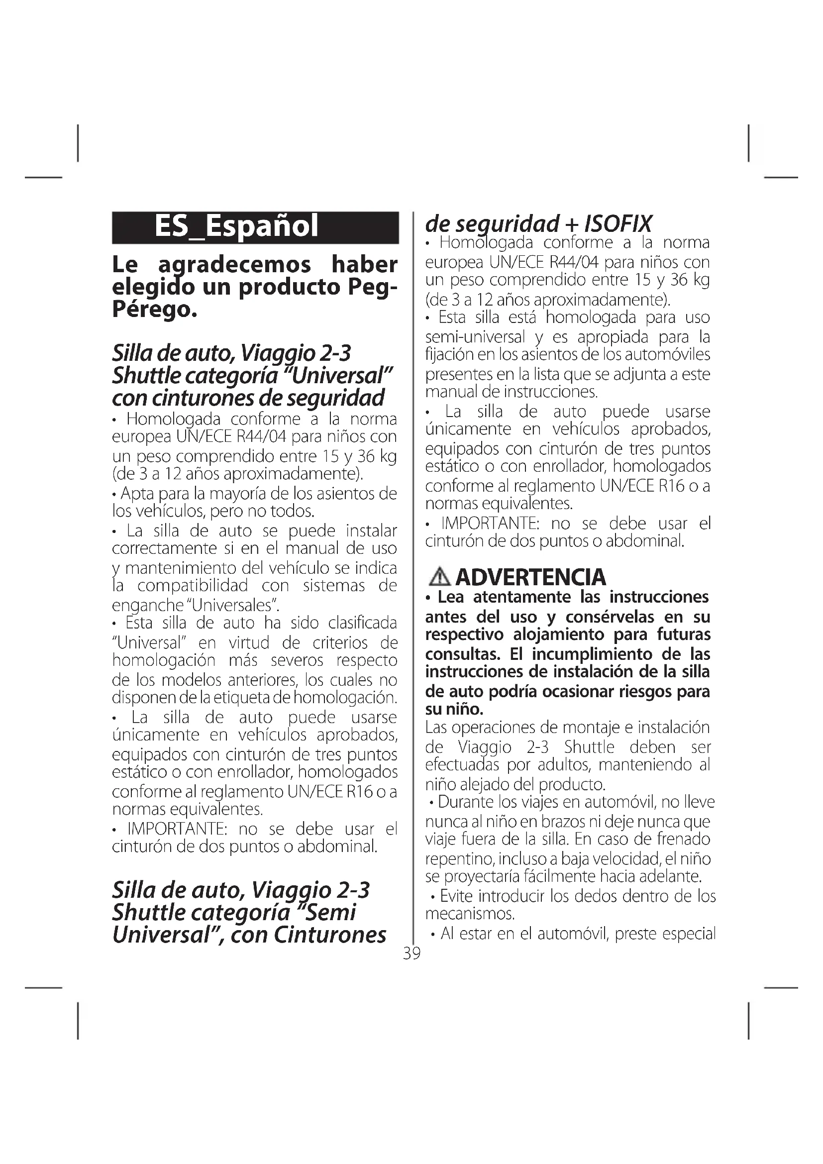 - El número progresivo de fabricación personaliza cada silla desde la concesión de la homologación. Cada silla posee su respectivo número. PEG-PÉREGO S.p.A Peg-Pérego SpA es una empresa con sistema de gestión de la calidad certificado por TÜV Italia Srl, de acuerdo con la norma ISO 9001. Peg- Pérego podrá aportar en cualquier momento modificaciones a los modelos que se describen en el presente manual por razones técnicas o comerciales. Servicio de asistencia Peg-Pérego Si se pierden o dañan algunas partes del modelo, utilice únicamente repuestos originales Peg-Pérego. Para cualquier reparación, sustitución, información acerca de los productos, venta de repuestos originales y accesorios, contacte con el Servicio de Asistencia Peg-Pérego indicando, si está presente, el número de serie del producto. tel. 0039/039/60.88.213 número gratuito: 800/147.414 (para llamar desde una red fija) fax 0039/039/33.09.992 e-mail assistenza@pegperego.it sitio internet www.pegperego.com Todos los derechos de propiedad intelectual sobre los contenidos de este manual de instrucciones pertenecen a PEGPEREGO S.p.A. y están protegidos por las leyes vigentes.45 BR-PT_Português Obrigado por escolher um produto Peg-Pérego. Cadeirinha para carro, Viaggio 2-3 Shuttle categoria “Universal” com cintos