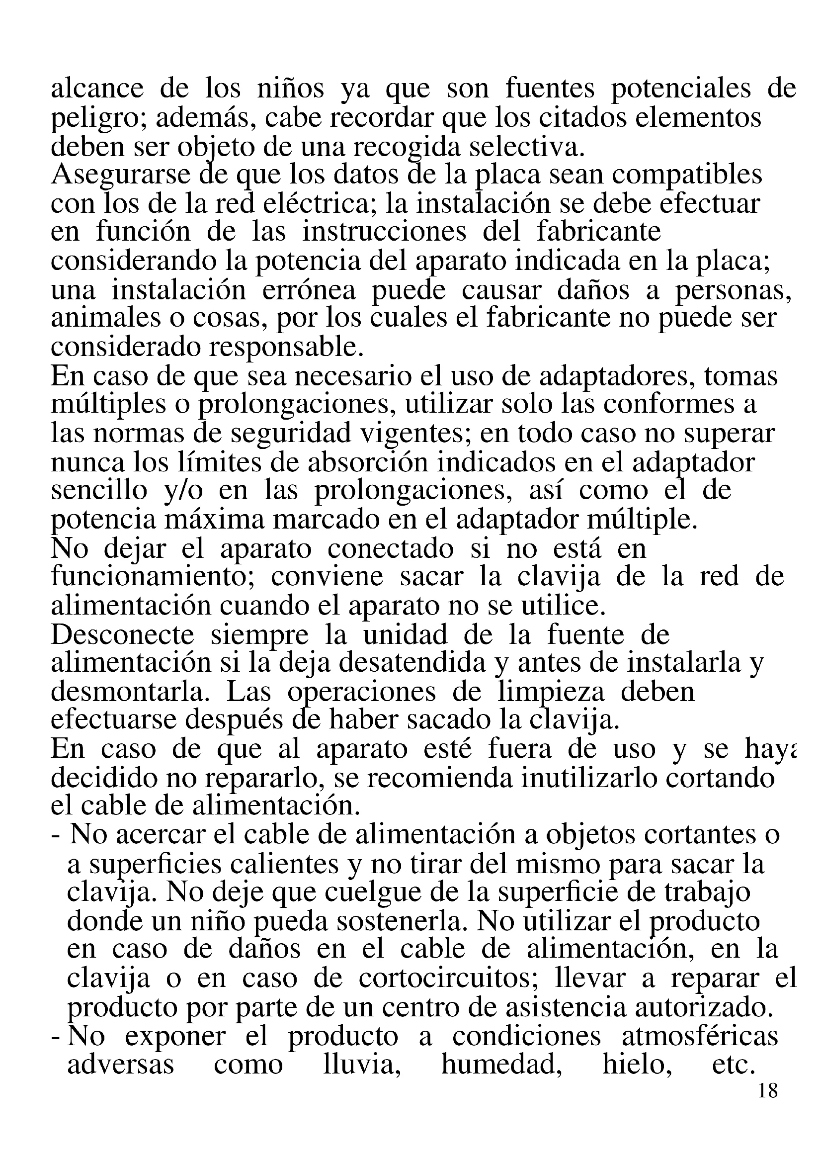 A continuación se presentan importantes indicaciones sobre la instalación, el uso y el mantenimiento. Conservar con cuidado este manual para cualquier consulta posterior; utilizar el producto solo de la manera que indica este manual de instrucciones; cualquier otro uso se considera inadecuado y peligroso; por ello el fabricante no puede ser considerado responsable en caso de que se produzcan daños derivados de usos inadecuados, erróneos o irracionales. Antes del uso asegurarse de la integridad del aparato; en caso de duda no utilizarlo y dirigirse al personal de asistencia; no dejar los elementos del embalaje (bolsas de plástico, poliestireno expandido, clavos, grapas, etc.) al18 alcance de los niños ya que son fuentes potenciales de peligro; además, cabe recordar que los citados elementos deben ser objeto de una recogida selectiva. Asegurarse de que los datos de la placa sean compatibles con los de la red eléctrica; la instalación se debe efectuar en función de las instrucciones del fabricante considerando la potencia del aparato indicada en la placa; una instalación errónea puede causar daños a personas, animales o cosas, por los cuales el fabricante no puede ser considerado responsable. En caso de que sea necesario el uso de adaptadores, tomas múltiples o prolongaciones, utilizar solo las conformes a las normas de seguridad vigentes; en todo caso no superar nunca los límites de absorción indicados en el adaptador sencillo y/o en las prolongaciones, así como el de potencia máxima marcado en el adaptador múltiple. No dejar el aparato conectado si no está en funcionamiento; conviene sacar la clavija de la red de alimentación cuando el aparato no se utilice. Desconecte siempre la unidad de la fuente de alimentación si la deja desatendida y antes de instalarla y desmontarla. Las operaciones de limpieza deben efectuarse después de haber sacado la clavija. En caso de que al aparato esté fuera de uso y se haya decidido no repararlo, se recomienda inutilizarlo cortando el cable de alimentación. - No acercar el cable de alimentación a objetos cortantes o a superficies calientes y no tirar del mismo para sacar la clavija. No deje que cuelgue de la superficie de trabajo donde un niño pueda sostenerla. No utilizar el producto en caso de daños en el cable de alimentación, en la clavija o en caso de cortocircuitos; llevar a reparar el producto por parte de un centro de asistencia autorizado. - No exponer el producto a condiciones atmosféricas adversas como lluvia, humedad, hielo, etc.19 Conservarlo en lugares secos. No manejar o tocar el producto con las manos húmedas o los pies descalzos. - Este aparato no debe ser usado por niños, incluso si son mayores de 8 años. - Este aparato puede ser utilizado por personas con capacidades físicas, sensoriales o mentales reducidas o con falta de experiencia o conocimiento si a dichas personas se ha asegurado una supervisión o bien si han recibido instrucciones sobre el uso seguro del aparato. - Los niños no deben jugar con el aparato. - Mantener el producto y el cable fuera del alcance de los niños menores de 8 años. - No apto para uso comercial. Solo para uso doméstico En caso de avería y/o de funcionamiento anómalo no manipular el aparato. Para una posible reparación, dirigirse únicamente a un centro autorizado por el fabricante y solicitar el uso de recambios originales. El incumplimiento de lo indicado anteriormente puede comprometer la seguridad del aparato y anular las condiciones de la garantía. ATENCIÓN: el producto tiene una función de calentamiento. Las superficies pueden desarrollar altas temperaturas. La percepción de la temperatura es distinta para cada persona, utilizar el aparato con cautela. Tocar solo las superficies diseñadas para ser tocadas, y usar agarradores o guantes de cocina. Este aparato está diseñado para uso doméstico o similares: cocinas para el personal de tiendas, oficinas u otros centros de trabajo, para clientes de hoteles, moteles, hostales y similares. El aparato no está diseñado para su uso a través de temporizadores externos o mandos a distancia. Antes de cada uso, desenrolle el cable de alimentación. Utilice únicamente piezas de repuesto y accesorios20 originales. No someta el producto a impactos fuertes se producirán daños serios.