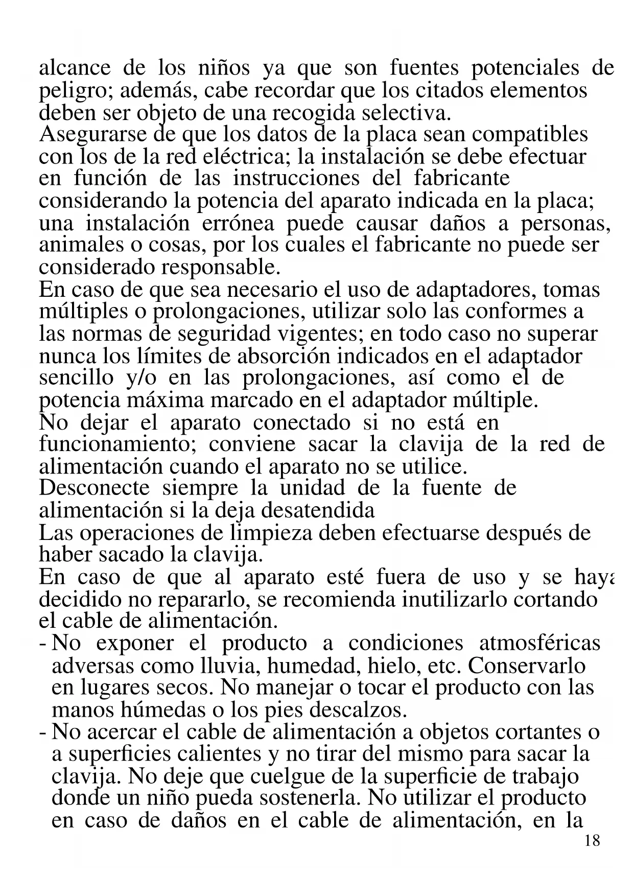 A continuación se presentan importantes indicaciones sobre la instalación, el uso y el mantenimiento. Conservar con cuidado este manual para cualquier consulta posterior; utilizar el producto solo de la manera que indica este manual de instrucciones; cualquier otro uso se considera inadecuado y peligroso; por ello el fabricante no puede ser considerado responsable en caso de que se produzcan daños derivados de usos inadecuados, erróneos o irracionales. Antes del uso asegurarse de la integridad del aparato; en caso de duda no utilizarlo y dirigirse al personal de asistencia; no dejar los elementos del embalaje (bolsas de plástico, poliestireno expandido, clavos, grapas, etc.) al18 alcance de los niños ya que son fuentes potenciales de peligro; además, cabe recordar que los citados elementos deben ser objeto de una recogida selectiva. Asegurarse de que los datos de la placa sean compatibles con los de la red eléctrica; la instalación se debe efectuar en función de las instrucciones del fabricante considerando la potencia del aparato indicada en la placa; una instalación errónea puede causar daños a personas, animales o cosas, por los cuales el fabricante no puede ser considerado responsable. En caso de que sea necesario el uso de adaptadores, tomas múltiples o prolongaciones, utilizar solo las conformes a las normas de seguridad vigentes; en todo caso no superar nunca los límites de absorción indicados en el adaptador sencillo y/o en las prolongaciones, así como el de potencia máxima marcado en el adaptador múltiple. No dejar el aparato conectado si no está en funcionamiento; conviene sacar la clavija de la red de alimentación cuando el aparato no se utilice. Desconecte siempre la unidad de la fuente de alimentación si la deja desatendida Las operaciones de limpieza deben efectuarse después de haber sacado la clavija. En caso de que al aparato esté fuera de uso y se haya decidido no repararlo, se recomienda inutilizarlo cortando el cable de alimentación. - No exponer el producto a condiciones atmosféricas adversas como lluvia, humedad, hielo, etc. Conservarlo en lugares secos. No manejar o tocar el producto con las manos húmedas o los pies descalzos. - No acercar el cable de alimentación a objetos cortantes o a superficies calientes y no tirar del mismo para sacar la clavija. No deje que cuelgue de la superficie de trabajo donde un niño pueda sostenerla. No utilizar el producto en caso de daños en el cable de alimentación, en la19 clavija o en caso de cortocircuitos; llevar a reparar el producto por parte de un centro de asistencia autorizado. - Este aparato puede ser utilizado por niños a partir de 8 años y por personas con capacidades físicas, sensoriales o mentales reducidas o con falta de experiencia o conocimiento si a dichas personas se ha asegurado una supervisión adecuada o bien si han recibido instrucciones sobre el uso seguro del aparato; las operaciones de limpieza y de mantenimiento no deben ser efectuadas por niños a no ser que tengan más de 8 años y estén supervisados. - Los niños no deben jugar con el aparato. - Mantener el producto y el cable fuera del alcance de los niños menores de 8 años. Si el cable de alimentación está dañado, o en caso de una falla y/o mal funcionamiento, no manipule el aparato. Cualquier reparación debe ser realizada por el fabricante o por su servicio de asistencia técnica o, en cualquier caso, por una persona con una calificación similar, a fin de evitar cualquier riesgo. El incumplimiento de lo anterior puede comprometer la seguridad del dispositivo e invalidar los términos de la garantía. ATENCIÓN: el producto tiene una función de calentamiento. Las superficies pueden desarrollar altas temperaturas. La percepción de la temperatura es distinta para cada persona, utilizar el aparato con cautela. Tocar solo las superficies diseñadas para ser tocadas. Este aparato está diseñado para uso doméstico o similares: cocinas para el personal de tiendas, oficinas u otros centros de trabajo, para clientes de hoteles, moteles, hostales y similares. El aparato no está diseñado para su uso a través de temporizadores externos o mandos a distancia. Antes de cada uso, desenrolle el cable de alimentación. Utilice únicamente piezas de repuesto y accesorios20 originales. No someta el producto a impactos fuertes se producirán daños serios. Mantenga la unidad lejos de materiales inflamables, calor, puntos fríos y vapor.
