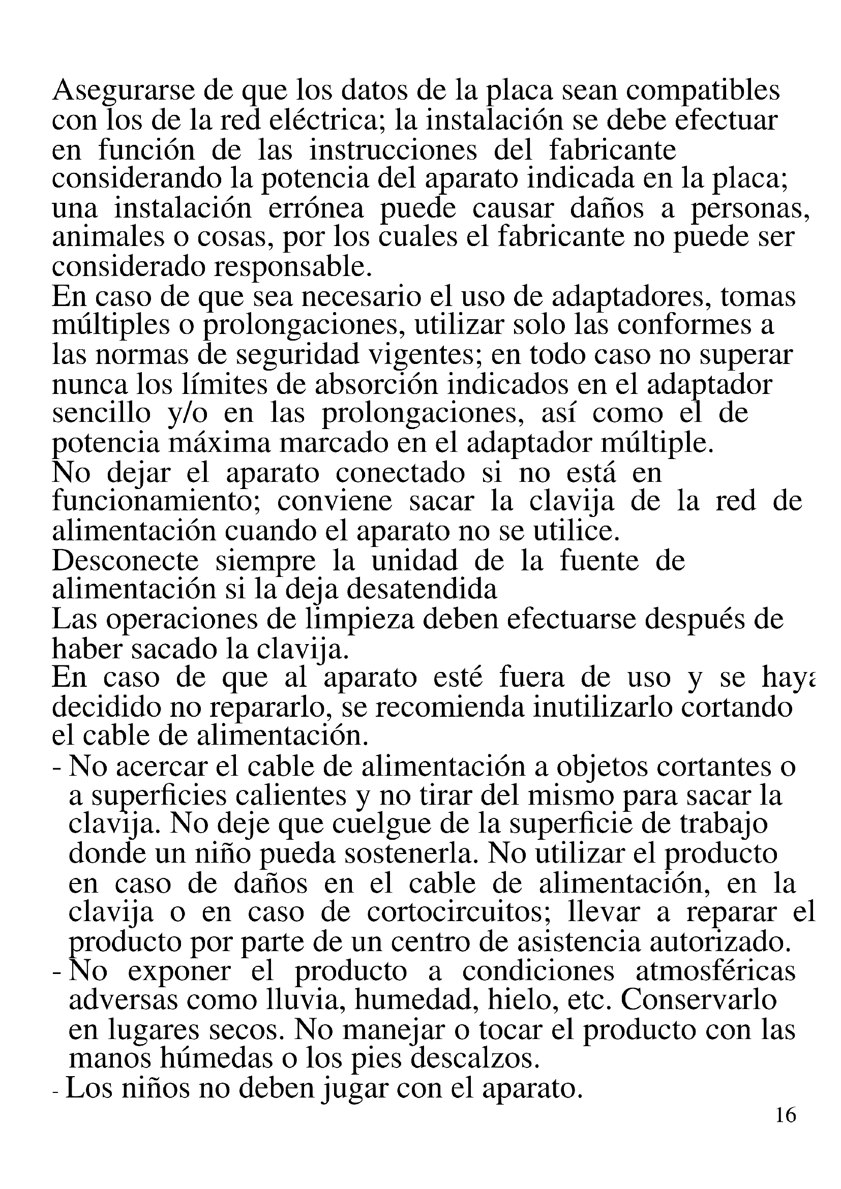A continuación se presentan importantes indicaciones sobre la instalación, el uso y el mantenimiento. Conservar con cuidado este manual para cualquier consulta posterior; utilizar el producto solo de la manera que indica este manual de instrucciones; cualquier otro uso se considera inadecuado y peligroso; por ello el fabricante no puede ser considerado responsable en caso de que se produzcan daños derivados de usos inadecuados, erróneos o irracionales. Antes del uso asegurarse de la integridad del aparato; en caso de duda no utilizarlo y dirigirse al personal de asistencia; no dejar los elementos del embalaje (bolsas de plástico, poliestireno expandido, clavos, grapas, etc.) al alcance de los niños ya que son fuentes potenciales de peligro; además, cabe recordar que los citados elementos deben ser objeto de una recogida selectiva.16 Asegurarse de que los datos de la placa sean compatibles con los de la red eléctrica; la instalación se debe efectuar en función de las instrucciones del fabricante considerando la potencia del aparato indicada en la placa; una instalación errónea puede causar daños a personas, animales o cosas, por los cuales el fabricante no puede ser considerado responsable. En caso de que sea necesario el uso de adaptadores, tomas múltiples o prolongaciones, utilizar solo las conformes a las normas de seguridad vigentes; en todo caso no superar nunca los límites de absorción indicados en el adaptador sencillo y/o en las prolongaciones, así como el de potencia máxima marcado en el adaptador múltiple. No dejar el aparato conectado si no está en funcionamiento; conviene sacar la clavija de la red de alimentación cuando el aparato no se utilice. Desconecte siempre la unidad de la fuente de alimentación si la deja desatendida Las operaciones de limpieza deben efectuarse después de haber sacado la clavija. En caso de que al aparato esté fuera de uso y se haya decidido no repararlo, se recomienda inutilizarlo cortando el cable de alimentación. - No acercar el cable de alimentación a objetos cortantes o a superficies calientes y no tirar del mismo para sacar la clavija. No deje que cuelgue de la superficie de trabajo donde un niño pueda sostenerla. No utilizar el producto en caso de daños en el cable de alimentación, en la clavija o en caso de cortocircuitos; llevar a reparar el producto por parte de un centro de asistencia autorizado. - No exponer el producto a condiciones atmosféricas adversas como lluvia, humedad, hielo, etc. Conservarlo en lugares secos. No manejar o tocar el producto con las manos húmedas o los pies descalzos. - Los niños no deben jugar con el aparato.17 - Este aparato puede ser utilizado por niños a partir de 8 años y por personas con capacidades físicas, sensoriales o mentales reducidas o con falta de experiencia o conocimiento si a dichas personas se ha asegurado una supervisión adecuada o bien si han recibido instrucciones sobre el uso seguro del aparato; las operaciones de limpieza y de mantenimiento no deben ser efectuadas por niños a no ser que tengan más de 8 años y estén supervisados. - Mantener el producto y el cable fuera del alcance de los niños menores de 8 años. Si el cable de alimentación está dañado, o en caso de una falla y/o mal funcionamiento, no manipule el aparato. Cualquier reparación debe ser realizada por el fabricante o por su servicio de asistencia técnica o, en cualquier caso, por una persona con una calificación similar, a fin de evitar cualquier riesgo. El incumplimiento de lo anterior puede comprometer la seguridad del dispositivo e invalidar los términos de la garantía. ATENCIÓN: el producto tiene una función de calentamiento. No lo cubras. En uso, deje espacios adecuados a los lados. Las superficies pueden desarrollar altas temperaturas. La percepción de la temperatura es distinta para cada persona, utilizar el aparato con cautela. Tocar solo las superficies diseñadas para ser tocadas. Este aparato está diseñado para uso doméstico o similares: cocinas para el personal de tiendas, oficinas u otros centros de trabajo, para clientes de hoteles, moteles, hostales y similares. El aparato no está diseñado para su uso a través de temporizadores externos o mandos a distancia. Antes de cada uso, desenrolle el cable de alimentación. Utilice únicamente piezas de repuesto y accesorios originales. No someta el producto a impactos fuertes se producirán daños serios.18 Mantenga la unidad lejos de materiales inflamables, calor, puntos fríos y vapor.