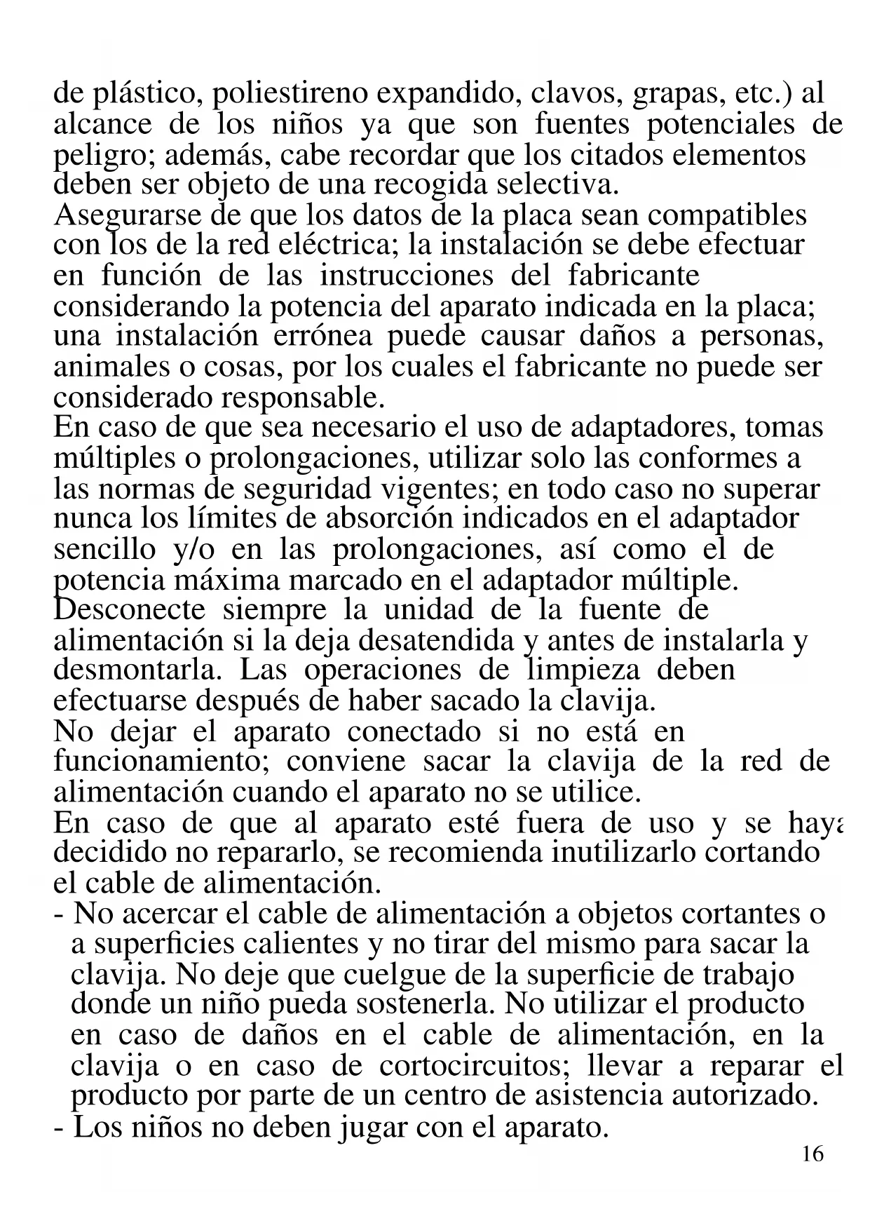 A continuación se presentan importantes indicaciones sobre la instalación, el uso y el mantenimiento. Conservar con cuidado este manual para cualquier consulta posterior; utilizar el producto solo de la manera que indica este manual de instrucciones; cualquier otro uso se considera inadecuado y peligroso; por ello el fabricante no puede ser considerado responsable en caso de que se produzcan daños derivados de usos inadecuados, erróneos o irracionales. Antes del uso asegurarse de la integridad del aparato; en caso de duda no utilizarlo y dirigirse al personal de asistencia; no dejar los elementos del embalaje (bolsas16 de plástico, poliestireno expandido, clavos, grapas, etc.) al alcance de los niños ya que son fuentes potenciales de peligro; además, cabe recordar que los citados elementos deben ser objeto de una recogida selectiva. Asegurarse de que los datos de la placa sean compatibles con los de la red eléctrica; la instalación se debe efectuar en función de las instrucciones del fabricante considerando la potencia del aparato indicada en la placa; una instalación errónea puede causar daños a personas, animales o cosas, por los cuales el fabricante no puede ser considerado responsable. En caso de que sea necesario el uso de adaptadores, tomas múltiples o prolongaciones, utilizar solo las conformes a las normas de seguridad vigentes; en todo caso no superar nunca los límites de absorción indicados en el adaptador sencillo y/o en las prolongaciones, así como el de potencia máxima marcado en el adaptador múltiple. Desconecte siempre la unidad de la fuente de alimentación si la deja desatendida y antes de instalarla y desmontarla. Las operaciones de limpieza deben efectuarse después de haber sacado la clavija. No dejar el aparato conectado si no está en funcionamiento; conviene sacar la clavija de la red de alimentación cuando el aparato no se utilice. En caso de que al aparato esté fuera de uso y se haya decidido no repararlo, se recomienda inutilizarlo cortando el cable de alimentación. - No acercar el cable de alimentación a objetos cortantes o a superficies calientes y no tirar del mismo para sacar la clavija. No deje que cuelgue de la superficie de trabajo donde un niño pueda sostenerla. No utilizar el producto en caso de daños en el cable de alimentación, en la clavija o en caso de cortocircuitos; llevar a reparar el producto por parte de un centro de asistencia autorizado. - Los niños no deben jugar con el aparato.17 - No exponer el producto a condiciones atmosféricas adversas como lluvia, humedad, hielo, etc. Conservarlo en lugares secos. No manejar o tocar el producto con las manos húmedas o los pies descalzos. - Este aparato puede ser utilizado por niños a partir de 8 años y por personas con capacidades físicas, sensoriales o mentales reducidas o con falta de experiencia o conocimiento si a dichas personas se ha asegurado una supervisión adecuada o bien si han recibido instrucciones sobre el uso seguro del aparato; las operaciones de limpieza y de mantenimiento no deben ser efectuadas por niños a no ser que tengan más de 8 años y estén supervisados. - Mantener el producto y el cable fuera del alcance de los niños menores de 8 años. - No apto para uso comercial. Solo para uso doméstico En caso de avería y/o de funcionamiento anómalo no manipular el aparato. Para una posible reparación, dirigirse únicamente a un centro autorizado por el fabricante y solicitar el uso de recambios originales. El incumplimiento de lo indicado anteriormente puede comprometer la seguridad del aparato y anular las condiciones de la garantía. ATENCIÓN: el producto tiene una función de calentamiento. Las superficies pueden desarrollar altas temperaturas. La percepción de la temperatura es distinta para cada persona, utilizar el aparato con cautela. Tocar solo las superficies diseñadas para ser tocadas, y usar agarradores o guantes de cocina. El aparato no está diseñado para su uso a través de temporizadores externos o mandos a distancia. Antes de cada uso, desenrolle el cable de alimentación. Utilice únicamente piezas de repuesto y accesorios originales. No someta el producto a impactos fuertes se producirán daños serios.18 Este aparato está diseñado para uso doméstico o similares: cocinas para el personal de tiendas, oficinas u otros centros de trabajo, para clientes de hoteles, moteles, hostales y similares. Mantenga la unidad lejos de materiales inflamables, calor, puntos fríos y vapor.