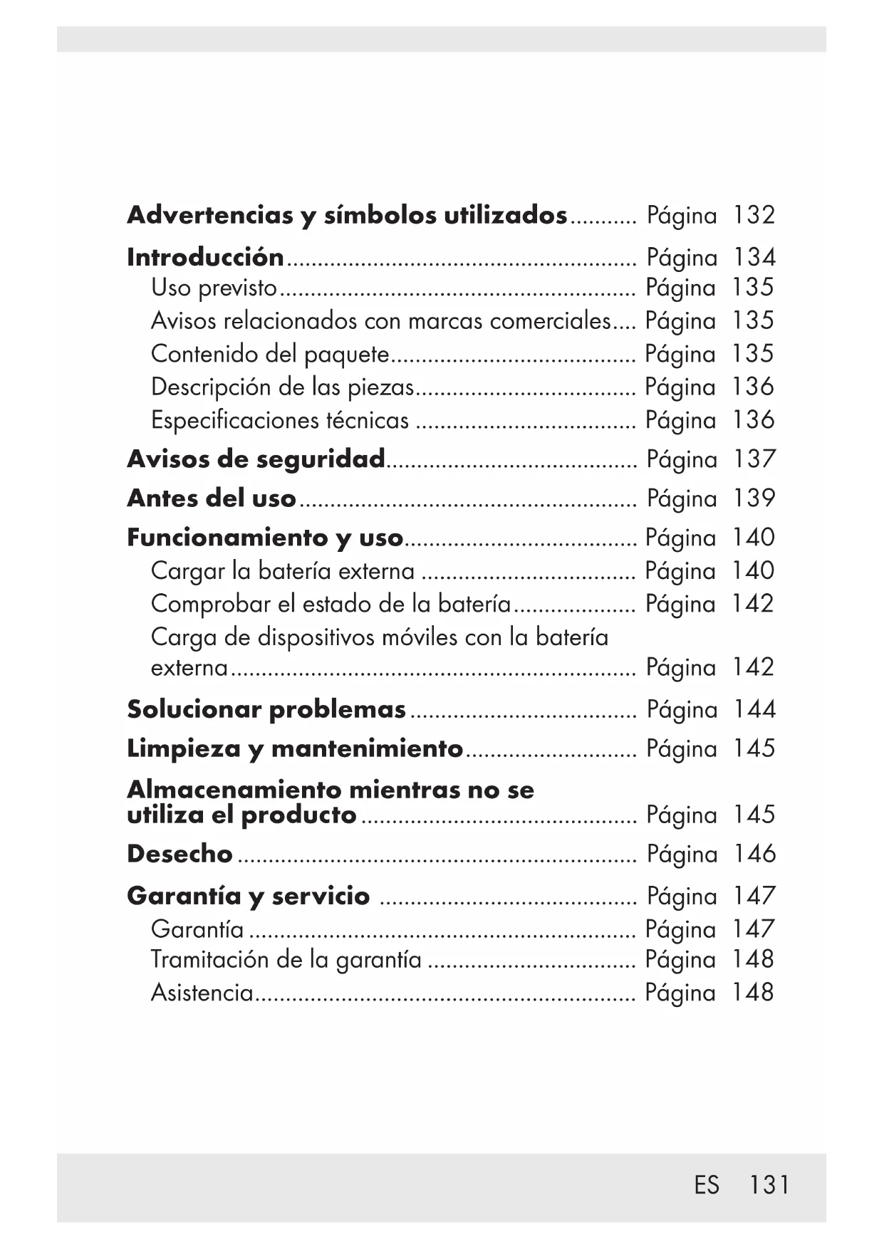 P Introducción Enhorabuena por la adquisición de su nuevo producto. Ha optado por un producto de alta calidad. El manual de instrucciones forma parte de este producto. Contiene importantes indicaciones sobre seguridad, uso y eliminación. Antes de usar el producto, familiarícese con todas las indicaciones de manejo y de seguridad. Utilice el producto únicamente como se describe a continuación y para las aplicaciones indicadas. Adjunte igualmente toda la documentación en caso de entregar el producto a terceros. PD: Power Delivery (PD), presentado por USB Implementers Forum, Inc., es una especificación para trabajar con una mayor potencia y permite que amplia gama de dispositivos se carguen rápidamente a través de una conexión USB. Funciona facilitando una conversación entre dos dispositivos para que puedan determinar cuánta energía se puede extraer del cargador. La marca CE indica la conformidad con las directivas de la UE aplicables a este producto.ES 135 Uso previsto Esta BATERÍA EXTERNA (en lo sucesivo, “producto”) es un dispositivo de Tecnología de la Información que está diseñado exclusivamente para utilizarse para cargar dispositivos móviles que normalmente se cargan a través de un puerto USB. Este producto no está diseñado para uso comercial. El fabricante no asume ninguna responsabilidad por daños derivados del uso no previsto. Avisos relacionados con marcas comerciales ‒ USB