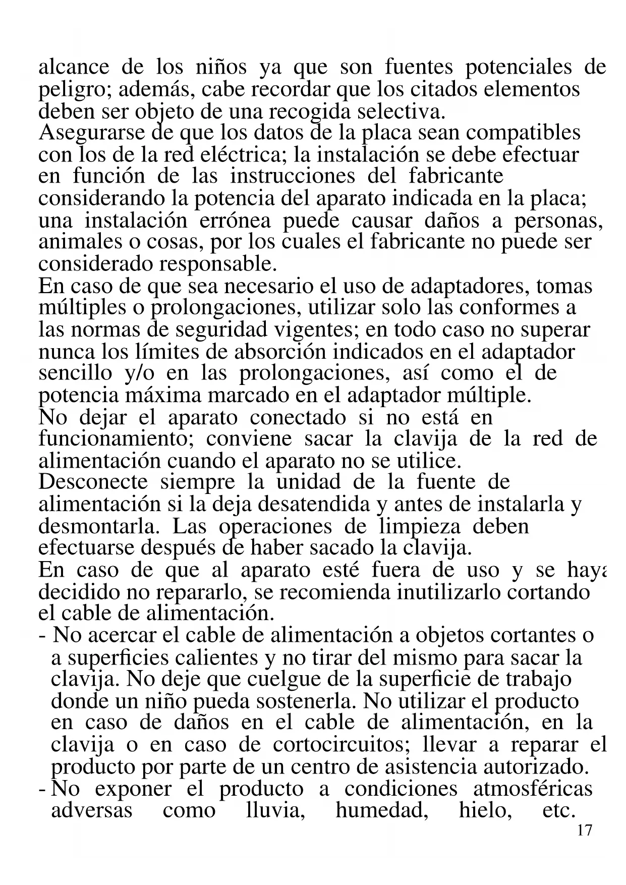 A continuación se presentan importantes indicaciones sobre la instalación, el uso y el mantenimiento. Conservar con cuidado este manual para cualquier consulta posterior; utilizar el producto solo de la manera que indica este manual de instrucciones; cualquier otro uso se considera inadecuado y peligroso; por ello el fabricante no puede ser considerado responsable en caso de que se produzcan daños derivados de usos inadecuados, erróneos o irracionales. Antes del uso asegurarse de la integridad del aparato; en caso de duda no utilizarlo y dirigirse al personal de asistencia; no dejar los elementos del embalaje (bolsas de plástico, poliestireno expandido, clavos, grapas, etc.) al17 alcance de los niños ya que son fuentes potenciales de peligro; además, cabe recordar que los citados elementos deben ser objeto de una recogida selectiva. Asegurarse de que los datos de la placa sean compatibles con los de la red eléctrica; la instalación se debe efectuar en función de las instrucciones del fabricante considerando la potencia del aparato indicada en la placa; una instalación errónea puede causar daños a personas, animales o cosas, por los cuales el fabricante no puede ser considerado responsable. En caso de que sea necesario el uso de adaptadores, tomas múltiples o prolongaciones, utilizar solo las conformes a las normas de seguridad vigentes; en todo caso no superar nunca los límites de absorción indicados en el adaptador sencillo y/o en las prolongaciones, así como el de potencia máxima marcado en el adaptador múltiple. No dejar el aparato conectado si no está en funcionamiento; conviene sacar la clavija de la red de alimentación cuando el aparato no se utilice. Desconecte siempre la unidad de la fuente de alimentación si la deja desatendida y antes de instalarla y desmontarla. Las operaciones de limpieza deben efectuarse después de haber sacado la clavija. En caso de que al aparato esté fuera de uso y se haya decidido no repararlo, se recomienda inutilizarlo cortando el cable de alimentación. - No acercar el cable de alimentación a objetos cortantes o a superficies calientes y no tirar del mismo para sacar la clavija. No deje que cuelgue de la superficie de trabajo donde un niño pueda sostenerla. No utilizar el producto en caso de daños en el cable de alimentación, en la clavija o en caso de cortocircuitos; llevar a reparar el producto por parte de un centro de asistencia autorizado. - No exponer el producto a condiciones atmosféricas adversas como lluvia, humedad, hielo, etc.18 Conservarlo en lugares secos. No manejar o tocar el producto con las manos húmedas o los pies descalzos. - Este aparato puede ser utilizado por niños a partir de 8 años y por personas con capacidades físicas, sensoriales o mentales reducidas o con falta de experiencia o conocimiento si a dichas personas se ha asegurado una supervisión adecuada o bien si han recibido instrucciones sobre el uso seguro del aparato; las operaciones de limpieza y de mantenimiento no deben ser efectuadas por niños a no ser que tengan más de 8 años y estén supervisados. - Los niños no deben jugar con el aparato. - Mantener el producto y el cable fuera del alcance de los niños menores de 8 años. - No apto para uso comercial. Solo para uso doméstico ATENCIÓN: el producto tiene una función de calentamiento. Las superficies pueden desarrollar altas temperaturas. La percepción de la temperatura es distinta para cada persona, utilizar el aparato con cautela. Tocar solo las superficies diseñadas para ser tocadas, y usar agarradores o guantes de cocina. En caso de avería y/o de funcionamiento anómalo no manipular el aparato. Para una posible reparación, dirigirse únicamente a un centro autorizado por el fabricante y solicitar el uso de recambios originales. El incumplimiento de lo indicado anteriormente puede comprometer la seguridad del aparato y anular las condiciones de la garantía. Este aparato está diseñado para uso doméstico o similares: cocinas para el personal de tiendas, oficinas u otros centros de trabajo, para clientes de hoteles, moteles, hostales y similares. El aparato no está diseñado para su uso a través de temporizadores externos o mandos a distancia. Antes de cada uso, desenrolle el cable de alimentación.19 Utilice únicamente piezas de repuesto y accesorios originales. No someta el producto a impactos fuertes se producirán daños serios.
