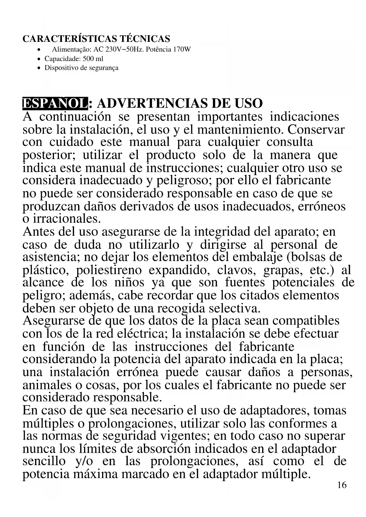 ESPAÑOL: ADVERTENCIAS DE USO