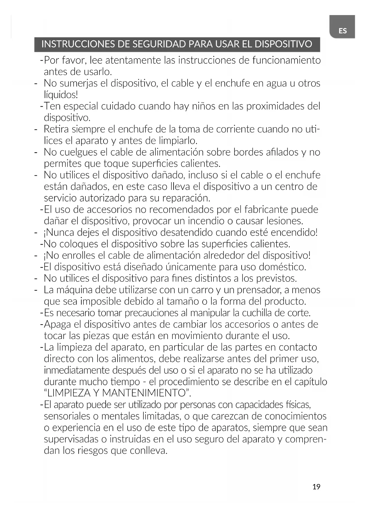 Por favor, lee atentamente las instrucciones de funcionamiento antes de usarlo. - No sumerjas el disposivo, el cable y el enchufe en agua u otros líquidos!
