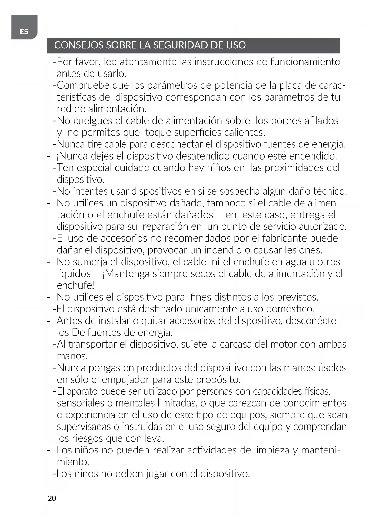 El uso de accesorios no recomendados por el fabricante puede dañar el disposivo, provocar un incendio o causar lesiones. - No sumerja el disposivo, el cable ni el enchufe en agua u otros líquidos – ¡Mantenga siempre secos el cable de alimentación y el enchufe! - No ulices el disposivo para nes disntos a los previstos. - El disposivo está desnado únicamente a uso domésco. - Antes de instalar o quitar accesorios del disposivo, desconécte