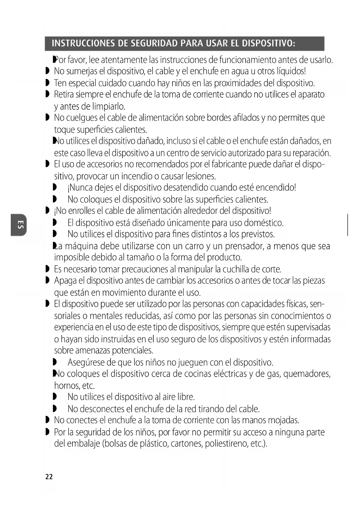 La máquina debe utilizarse con un carro y un prensador, a menos que sea imposible debido al tamaño o la forma del producto. Es necesario tomar precauciones al manipular la cuchilla de corte. Apaga el dispositivo antes de cambiar los accesorios o antes de tocar las piezas que están en movimiento durante el uso. El dispositivo puede ser utilizado por las personas con capacidades físicas, sen