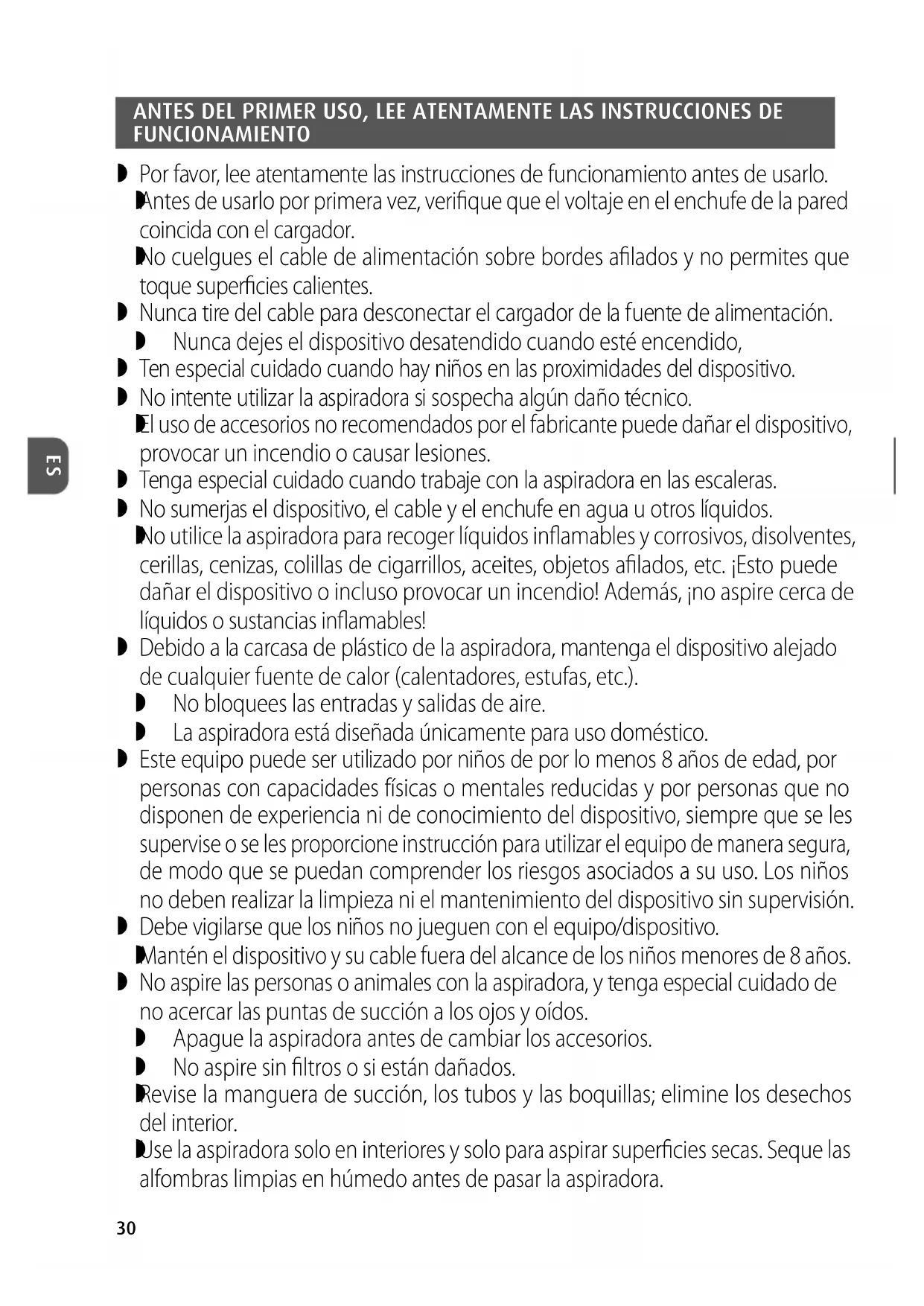 No utilice la aspiradora para recoger líquidos inflamables y corrosivos, disolventes, cerillas, cenizas, colillas de cigarrillos, aceites, objetos afilados, etc. ¡Esto puede dañar el dispositivo o incluso provocar un incendio! Además, ¡no aspire cerca de líquidos o sustancias inflamables! Debido a la carcasa de plástico de la aspiradora, mantenga el dispositivo alejado de cualquier fuente de calor (calentadores, estufas, etc.). No bloquees las entradas y salidas de aire. La aspiradora está diseñada únicamente para uso doméstico. Este equipo puede ser utilizado por niños de por lo menos 8 años de edad, por personas con capacidades físicas o mentales reducidas y por personas que no disponen de experiencia ni de conocimiento del dispositivo, siempre que se les supervise o se les proporcione instrucción para utilizar el equipo de manera segura, de modo que se puedan comprender los riesgos asociados a su uso. Los niños no deben realizar la limpieza ni el mantenimiento del dispositivo sin supervisión. Debe vigilarse que los niños no jueguen con el equipo/dispositivo.