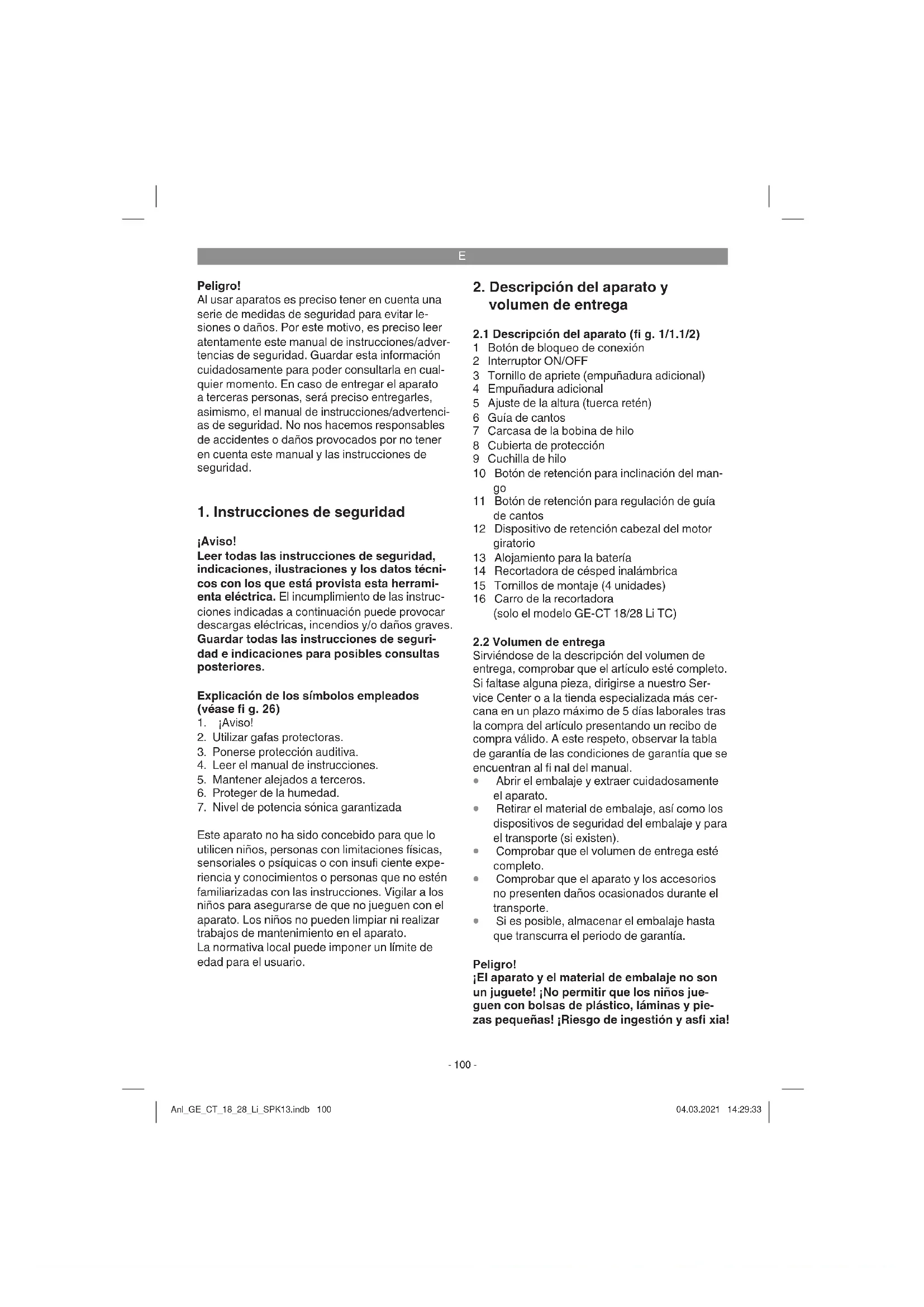 Si es posible, almacenar el embalaje hasta que transcurra el periodo de garantía. Peligro! ¡El aparato y el material de embalaje no son un juguete! ¡No permitir que los niños jue- guen con bolsas de plástico, láminas y pie- zas pequeñas! ¡Riesgo de ingestión y asfi xia! Anl_GE_CT_18_28_Li_SPK13.indb 100Anl_GE_CT_18_28_Li_SPK13.indb 100 04.03.2021 14:29:3304.03.2021 14:29:33E