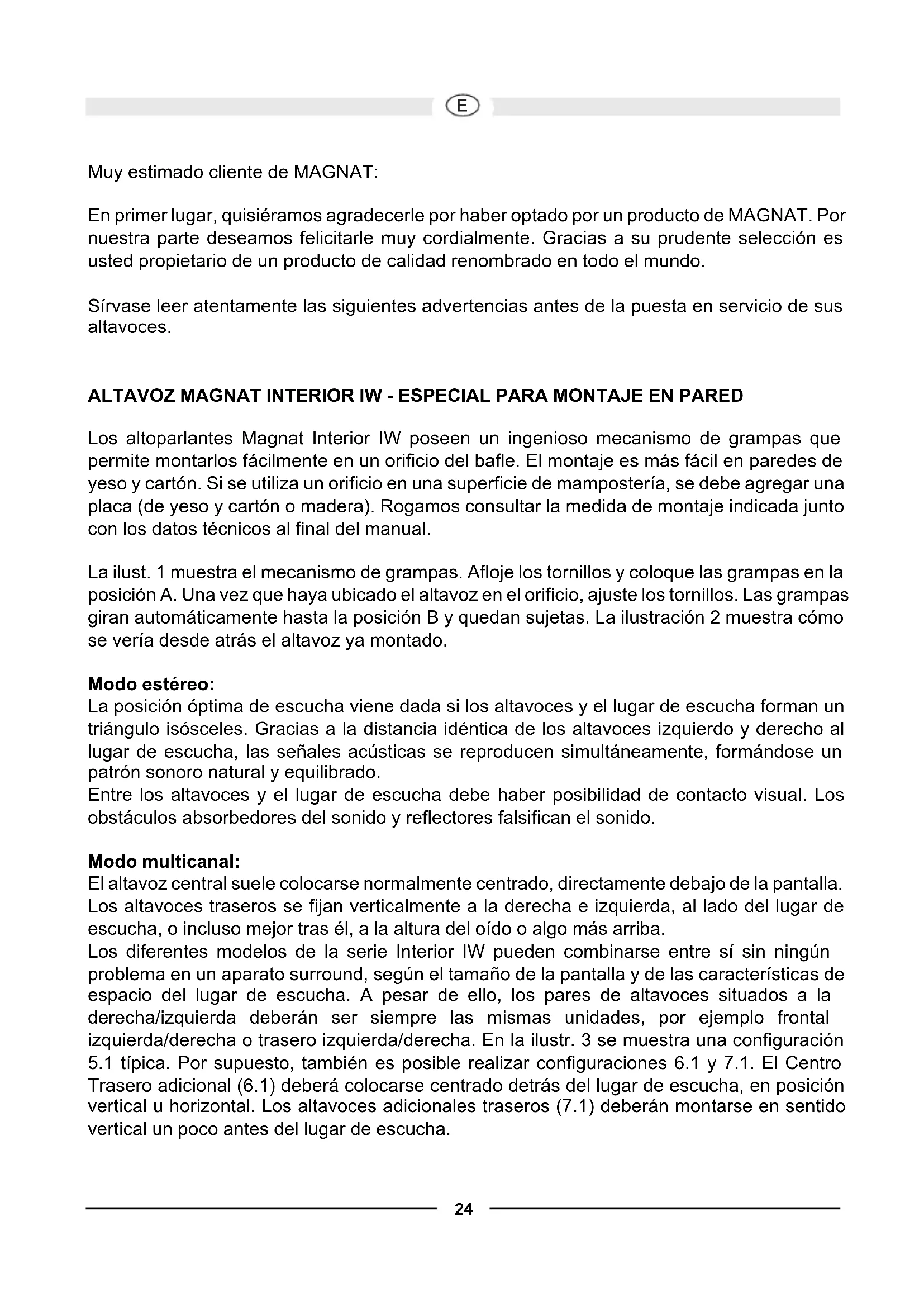 Muy estimado cliente de MAGNAT: En primer lugar, quisiéramos agradecerle por haber optado por un producto de MAGNAT. Por nuestra parte deseamos felicitarle muy cordialmente. Gracias a su prudente selección es usted propietario de un producto de calidad renombrado en todo el mundo. Sírvase leer atentamente las siguientes advertencias antes de la puesta en servicio de sus altavoces. ALTAVOZ MAGNAT INTERIOR IW - ESPECIAL PARA MONTAJE EN PARED Los altoparlantes Magnat Interior IW poseen un ingenioso mecanismo de grampas que permite montarlos fácilmente en un orificio del bafle. El montaje es más fácil en paredes de yeso y cartón. Si se utiliza un orificio en una superficie de mampostería, se debe agregar una placa (de yeso y cartón o madera). Rogamos consultar la medida de montaje indicada junto con los datos técnicos al final del manual. La ilust. 1 muestra el mecanismo de grampas. Afloje los tornillos y coloque las grampas en la posición A. Una vez que haya ubicado el altavoz en el orificio, ajuste los tornillos. Las grampas giran automáticamente hasta la posición B y quedan sujetas. La ilustración 2 muestra cómo se vería desde atrás el altavoz ya montado. Modo estéreo: La posición óptima de escucha viene dada si los altavoces y el lugar de escucha forman un triángulo isósceles. Gracias a la distancia idéntica de los altavoces izquierdo y derecho al lugar de escucha, las señales acústicas se reproducen simultáneamente, formándose un patrón sonoro natural y equilibrado. Entre los altavoces y el lugar de escucha debe haber posibilidad de contacto visual. Los obstáculos absorbedores del sonido y reflectores falsifican el sonido. Modo multicanal: El altavoz central suele colocarse normalmente centrado, directamente debajo de la pantalla. Los altavoces traseros se fijan verticalmente a la derecha e izquierda, al lado del lugar de escucha, o incluso mejor tras él, a la altura del oído o algo más arriba. Los diferentes modelos de la serie Interior IW pueden combinarse entre sí sin ningún problema en un aparato surround, según el tamaño de la pantalla y de las características de espacio del lugar de escucha. A pesar de ello, los pares de altavoces situados a la derecha/izquierda deberán ser siempre las mismas unidades, por ejemplo frontal izquierda/derecha o trasero izquierda/derecha. En la ilustr. 3 se muestra una configuración