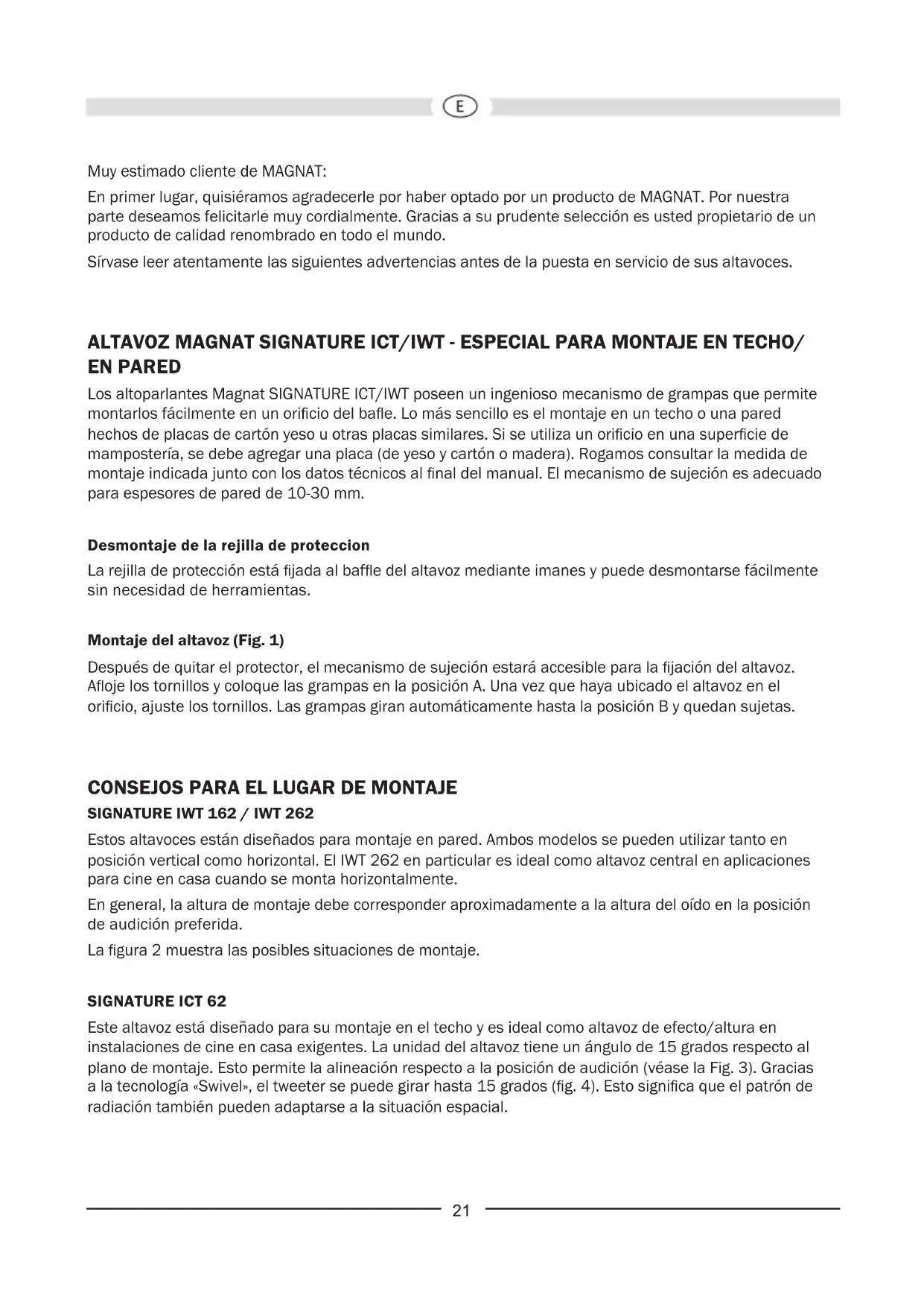 Muy estimado cliente de MAGNAT: En primer lugar, quisiéramos agradecerle por haber optado por un producto de MAGNAT. Por nuestra parte deseamos felicitarle muy cordialmente. Gracias a su prudente selección es usted propietario de un producto de calidad renombrado en todo el mundo. Sírvase leer atentamente las siguientes advertencias antes de la puesta en servicio de sus altavoces. ALTAVOZ MAGNAT SIGNATURE ICT/IWT - ESPECIAL PARA MONTAJE EN TECHO/ EN PARED Los altoparlantes Magnat SIGNATURE ICT/IWT poseen un ingenioso mecanismo de grampas que permite montarlos fácilmente en un oricio del bae. Lo más sencillo es el montaje en un techo o una pared hechos de placas de cartón yeso u otras placas similares. Si se utiliza un oricio en una supercie de mampostería, se debe agregar una placa (de yeso y cartón o madera). Rogamos consultar la medida de montaje indicada junto con los datos técnicos al nal del manual. El mecanismo de sujeción es adecuado para espesores de pared de 10-30 mm. Desmontaje de la rejilla de proteccion La rejilla de protección está jada al bafe del altavoz mediante imanes y puede desmontarse fácilmente sin necesidad de herramientas. Montaje del altavoz (Fig. 1) Después de quitar el protector, el mecanismo de sujeción estará accesible para la jación del altavoz. Aoje los tornillos y coloque las grampas en la posición A. Una vez que haya ubicado el altavoz en el oricio, ajuste los tornillos. Las grampas giran automáticamente hasta la posición B y quedan sujetas.