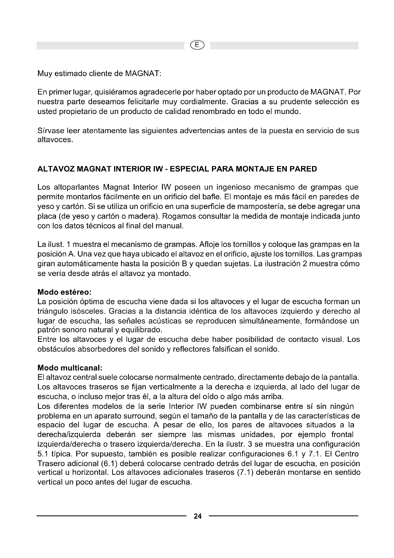 Muy estimado cliente de MAGNAT: En primer lugar, quisiéramos agradecerle por haber optado por un producto de MAGNAT. Por nuestra parte deseamos felicitarle muy cordialmente. Gracias a su prudente selección es usted propietario de un producto de calidad renombrado en todo el mundo. Sírvase leer atentamente las siguientes advertencias antes de la puesta en servicio de sus altavoces. ALTAVOZ MAGNAT INTERIOR IW - ESPECIAL PARA MONTAJE EN PARED Los altoparlantes Magnat Interior IW poseen un ingenioso mecanismo de grampas que permite montarlos fácilmente en un orificio del bafle. El montaje es más fácil en paredes de yeso y cartón. Si se utiliza un orificio en una superficie de mampostería, se debe agregar una placa (de yeso y cartón o madera). Rogamos consultar la medida de montaje indicada junto con los datos técnicos al final del manual. La ilust. 1 muestra el mecanismo de grampas. Afloje los tornillos y coloque las grampas en la posición A. Una vez que haya ubicado el altavoz en el orificio, ajuste los tornillos. Las grampas giran automáticamente hasta la posición B y quedan sujetas. La ilustración 2 muestra cómo se vería desde atrás el altavoz ya montado. Modo estéreo: La posición óptima de escucha viene dada si los altavoces y el lugar de escucha forman un triángulo isósceles. Gracias a la distancia idéntica de los altavoces izquierdo y derecho al lugar de escucha, las señales acústicas se reproducen simultáneamente, formándose un patrón sonoro natural y equilibrado. Entre los altavoces y el lugar de escucha debe haber posibilidad de contacto visual. Los obstáculos absorbedores del sonido y reflectores falsifican el sonido. Modo multicanal: El altavoz central suele colocarse normalmente centrado, directamente debajo de la pantalla. Los altavoces traseros se fijan verticalmente a la derecha e izquierda, al lado del lugar de escucha, o incluso mejor tras él, a la altura del oído o algo más arriba. Los diferentes modelos de la serie Interior IW pueden combinarse entre sí sin ningún problema en un aparato surround, según el tamaño de la pantalla y de las características de espacio del lugar de escucha. A pesar de ello, los pares de altavoces situados a la derecha/izquierda deberán ser siempre las mismas unidades, por ejemplo frontal izquierda/derecha o trasero izquierda/derecha. En la ilustr. 3 se muestra una configuración