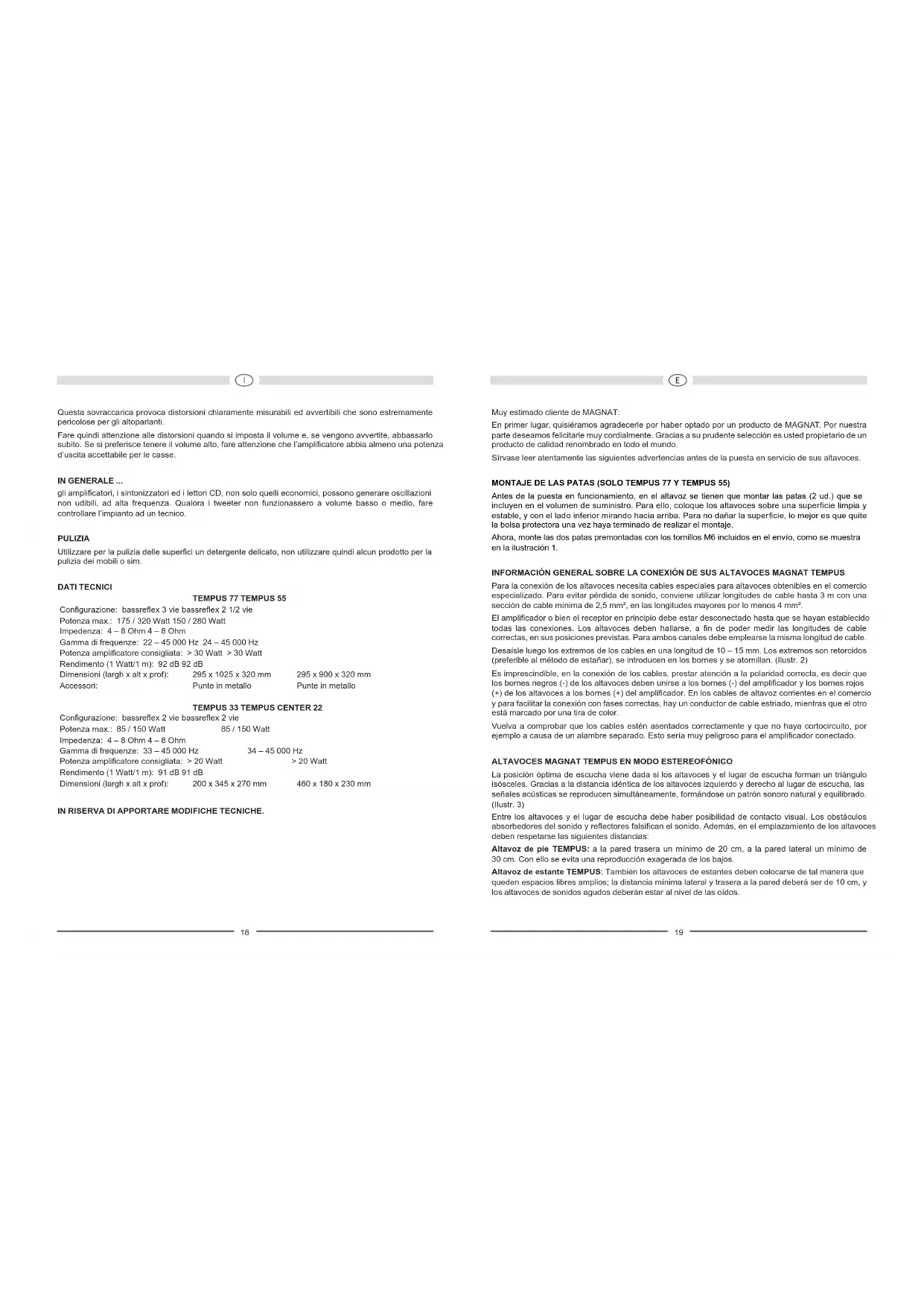 Muy estimado cliente de MAGNAT: En primer lugar, quisiéramos agradecerle por haber optado por un producto de MAGNAT. Por nuestra parte deseamos felicitarle muy cordialmente. Gracias a su prudente selección es usted propietario de un producto de calidad renombrado en todo el mundo. Sírvase leer atentamente las siguientes advertencias antes de la puesta en servicio de sus altavoces. MONTAJE DE LAS PATAS (SOLO TEMPUS 77 Y TEMPUS 55) Antes de la puesta en funcionamiento, en el altavoz se tienen que montar las patas (2 ud.) que se incluyen en el volumen de suministro. Para ello, coloque los altavoces sobre una supercie limpia y estable, y con el lado inferior mirando hacia arriba. Para no dañar la supercie, lo mejor es que quite la bolsa protectora una vez haya terminado de realizar el montaje. Ahora, monte las dos patas premontadas con los tornillos M6 incluidos en el envío, como se muestra en la ilustración 1. INFORMACIÓN GENERAL SOBRE LA CONEXIÓN DE SUS ALTAVOCES MAGNAT TEMPUS Para la conexión de los altavoces necesita cables especiales para altavoces obtenibles en el comercio especializado. Para evitar pérdida de sonido, conviene utilizar longitudes de cable hasta 3 m con una sección de cable mínima de 2,5 mm², en las longitudes mayores por lo menos 4 mm². El amplicador o bien el receptor en principio debe estar desconectado hasta que se hayan establecido todas las conexiones. Los altavoces deben hallarse, a n de poder medir las longitudes de cable correctas, en sus posiciones previstas. Para ambos canales debe emplearse la misma longitud de cable. Desaísle luego los extremos de los cables en una longitud de 10 – 15 mm. Los extremos son retorcidos (preferible al método de estañar), se introducen en los bornes y se atornillan. (Ilustr. 2) Es imprescindible, en la conexión de los cables, prestar atención a la polaridad correcta, es decir que los bornes negros (-) de los altavoces deben unirse a los bornes (-) del amplicador y los bornes rojos (+) de los altavoces a los bornes (+) del amplicador. En los cables de altavoz corrientes en el comercio y para facilitar la conexión con fases correctas, hay un conductor de cable estriado, mientras que el otro está marcado por una tira de color. Vuelva a comprobar que los cables estén asentados correctamente y que no haya cortocircuito, por ejemplo a causa de un alambre separado. Esto sería muy peligroso para el amplicador conectado. ALTAVOCES MAGNAT TEMPUS EN MODO ESTEREOFÓNICO La posición óptima de escucha viene dada si los altavoces y el lugar de escucha forman un triángulo isósceles. Gracias a la distancia idéntica de los altavoces izquierdo y derecho al lugar de escucha, las señales acústicas se reproducen simultáneamente, formándose un patrón sonoro natural y equilibrado. (Ilustr. 3) Entre los altavoces y el lugar de escucha debe haber posibilidad de contacto visual. Los obstáculos absorbedores del sonido y reectores falsican el sonido. Además, en el emplazamiento de los altavoces deben respetarse las siguientes distancias: Altavoz de pie TEMPUS: a la pared trasera un mínimo de 20 cm, a la pared lateral un mínimo de 30 cm. Con ello se evita una reproducción exagerada de los bajos. Altavoz de estante TEMPUS: También los altavoces de estantes deben colocarse de tal manera que queden espacios libres amplios; la distancia mínima lateral y trasera a la pared deberá ser de 10 cm, y los altavoces de sonidos agudos deberán estar al nivel de las oídos. 19Puntas (altavoz de pie TEMPUS): En el emplazamiento conviene utilizar las puntas suministradas. Con éstas, los altavoces son desacoplados de su base, lo que impide la aparición de resonancias indeseables. En los altavoces de pie puede optar entre puntas de metal o de caucho endurecido. Las puntas se enroscan en los casquillos ubicados en la cara inferior de los altavoces. ALTAVOCES MAGNAT TEMPUS COMO ALTAVOZ FRONTAL O TRASERO Los altavoces frontales deberán colocarse a la derecha e izquierda de la televisión, a ser posible a la misma distancia de la misma y a la altura de los oídos. Los altavoces traseros deberán colocarse a la derecha e izquierda al lado o si es posible detrás del lugar de audición a la altura de los oídos o una altura algo superior. (Ilustr. 4) BI-WRING Y BI-AMPING (TEMPUS 77 Y TEMPUS 55) Bi-wiring signica que las frecuencias altas y bajas son transportadas por cables separados. El método bi-amping requiere, además, que aparte del segundo cable haya un segundo amplicador nal adicional. Sobre todo este último método permite mejorar ulteriormente la reproducción. Los altavoces TEMPUS han sido preparados, mediante terminales especiales de conexión, tanto para el régimen bi-wiring como también para bi-ampling. Ello puede apreciarse, exteriormente, por los 4 racores roscados. Los dos de arriba conducen al altavoz de sonidos agudos y los inferiores al altavoz de sonidos bajos. Las conexiones positivas y negativas han sido unidas, desde fábrica, mediante puentes metálicos que deben quitarse para bi-wiring y bi-amping. La conexión correcta de los altavoces es representada por la g. 5a (convencional), la g. 5b (bi-wiring) y la g. 5c (bi-amping).