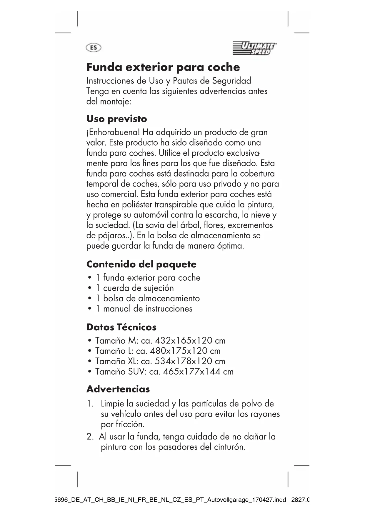onamientos. Cuando el vehículo esté estaciona- do en la calle o en aparcamientos de vehículos públicos, las placas de matrícula deben estar visibles. 285696_DE_AT_CH_BB_IE_NI_FR_BE_NL_CZ_ES_PT_Autovollgarage_170427.indd 2927.04.17 11:0116. Si la funda pasa a terceros, asegúrese de proporcionarles estas advertencias.