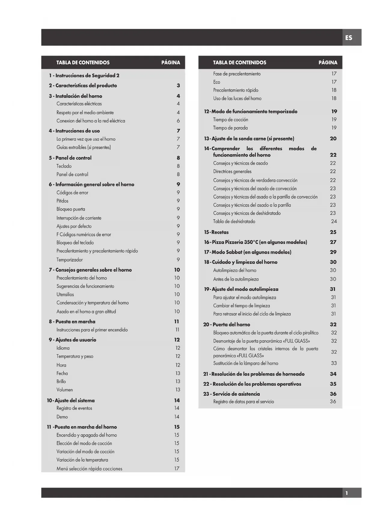 Antes de llamar al servicio verifique los siguientes puntos para evitar sobrecargarlo de forma innecesaria. Problema del horno Pasos para resolver el problema En la ventana del display aparece el error F1030* o F2030* Se ha producido un problema con el mecanismo del cerrojo Apague la corriente general y vuelva a encenderla pasados unos segundos. El horno no realiza un auto-test de la rejilla. Si la condición persiste anote el número de código (en la lista REGISTRO EVENTO) y póngase en contacto con el servicio. En la ventana aparece otro F_Error. Apague la corriente general y vuelva a encenderla pasados unos segundos. Si la condición persiste anote el número de código (en la lista REGISTRO EVENTO) y póngase en contacto con el servicio. El display del horno permanece en OFF Apague la corriente general (caja de fusibles o cortocircuito). Encienda el disyuntor. Si la condición persiste llame al servicio de asistencia autorizado. El ventilador de enfriamiento sigue funcionando después de haberlo apagado. El ventilador se apaga automáticamente cuando todos los componentes electrónicos se han enfriado bastante. La puerta del horno está bloqueada y no se abre incluso después del enfriamiento. Apague el horno y el disyuntor de circuito y espere unos segundos. Encienda el disyuntor. El horno debe reajustarse solo y ser operativo. El horno no está calentando. Verifique el disyuntor de circuito o la caja de fusibles. Asegúrese de que el horno recibe una alimentación eléctrica adecuada. Asegúrese de que se ha seleccionado la temperatura del horno. El horno no cuece de manera uniforme Consulte las tablas del horno para averiguar cuál es la posición recomendada de la rejilla. Reducir siempre la temperatura de la receta 25°F (15°C) cuando se cuece en modo horneado convección. La luz del horno no funciona correctamente Cambie o vuelva a poner la bombilla si está floja o si es defectuosa. Consulte la página 33. Procure no tocar el cristal de la bombilla con los dedos, dado que la grasa de estos puede causar que la bombilla se queme prematuramente. La luz del horno se queda encendida Verifique si la puerta del horno está obstruida Verifique si la bisagra está doblada o si se ha roto el interruptor de la puerta. El horno no se autolimpia correctamente. Deje que el horno se enfríe antes de poner en funcionamiento la autolimpieza. Limpie siempre la suciedad o las incrustaciones antes de poner en marcha la autolimpieza. Si el horno está muy sucio programe una autolimpieza de cuatro horas. Consulte la página sobre cómo preparar el horno para la autolimpieza 31. El reloj y el temporizador no funcionan adecuadamente Asegúrese de que el horno recibe una alimentación eléctrica adecuada. Consulte las secciones reloj en la página 12. Exceso de humedad Caliente previamente el horno cuando use el modo horneado. El horneado y el asado de convección eliminarán toda la humedad del horno (es una de las ventajas de la convección). Esquirlas de porcelana Cuando se sacan y se cambian las rejillas del horno tire siempre de estas hacia arriba sin forzarlas para evitar que la porcelana se desmenuce.ES