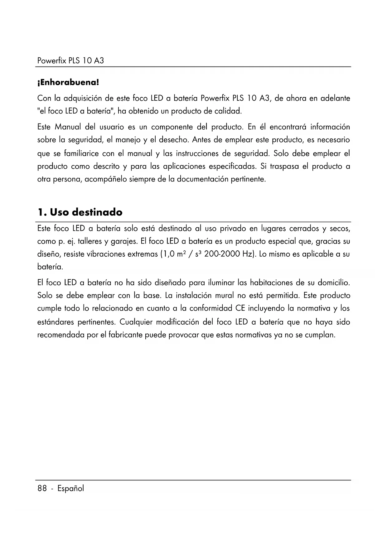 ¡Enhorabuena! Con la adquisición de este foco LED a batería Powerfix PLS 10 A3, de ahora en adelante "el foco LED a batería", ha obtenido un producto de calidad. Este Manual del usuario es un componente del producto. En él encontrará información sobre la seguridad, el manejo y el desecho. Antes de emplear este producto, es necesario que se familiarice con el manual y las instrucciones de seguridad. Solo debe emplear el producto como descrito y para las aplicaciones especificadas. Si traspasa el producto a otra persona, acompáñelo siempre de la documentación pertinente.