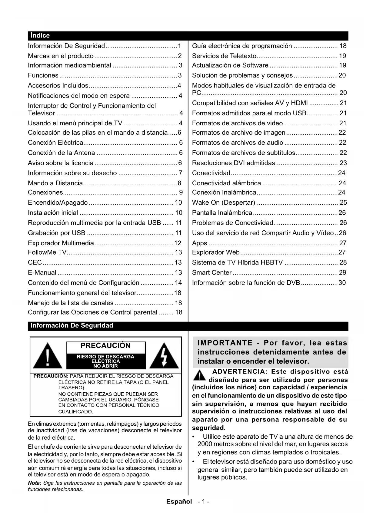CUALIFICADO. Nota: Siga las instrucciones en pantalla para la operación de las funciones relacionadas. En climas extremos (tormentas, relámpagos) y largos periodos de inactividad (irse de vacaciones) desconecte el televisor de la red eléctrica. El enchufe de corriente sirve para desconectar el televisor de la electricidad y, por lo tanto, siempre debe estar accesible. Si el televisor no se desconecta de la red eléctrica, el dispositivo aún consumirá energía para todas las situaciones, incluso si el televisor está en modo de espera o apagado. IMPORTANTE - Por favor, lea estas instrucciones detenidamente antes de instalar o encender el televisor. ADVERTENCIA: Este dispositivo está diseñado para ser utilizado por personas (incluidos los niños) con capacidad / experiencia en el funcionamiento de un dispositivo de este tipo sin supervisión, a menos que hayan recibido supervisión o instrucciones relativas al uso del aparato por una persona responsable de su seguridad.