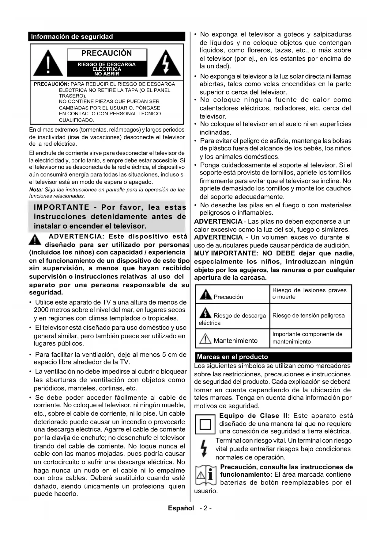 Información sobre la función de DVB .................... 32Español - 2 - Información de seguridad PRECAUCIÓN RIESGO DE DESCARGA ELÉCTRICANO ABRIRPRECAUCIÓN: PARA REDUCIR EL RIESGO DE DESCARGA ELÉCTRICA NO RETIRE LA TAPA (O EL PANEL TRASERO). NO CONTIENE PIEZAS QUE PUEDAN SER CAMBIADAS POR EL USUARIO. PÓNGASE EN CONTACTO CON PERSONAL TÉCNICO CUALIFICADO. Nota: Siga las instrucciones en pantalla para la operación de las funciones relacionadas. En climas extremos (tormentas, relámpagos) y largos periodos de inactividad (irse de vacaciones) desconecte el televisor de la red eléctrica. El enchufe de corriente sirve para desconectar el televisor de la electricidad y, por lo tanto, siempre debe estar accesible. Si el televisor no se desconecta de la red eléctrica, el dispositivo aún consumirá energía para todas las situaciones, incluso si el televisor está en modo de espera o apagado. IMPORTANTE - Por favor, lea estas instrucciones detenidamente antes de instalar o encender el televisor. ADVERTENCIA: Este dispositivo está diseñado para ser utilizado por personas (incluidos los niños) con capacidad / experiencia en el funcionamiento de un dispositivo de este tipo sin supervisión, a menos que hayan recibido supervisión o instrucciones relativas al uso del aparato por una persona responsable de su seguridad.