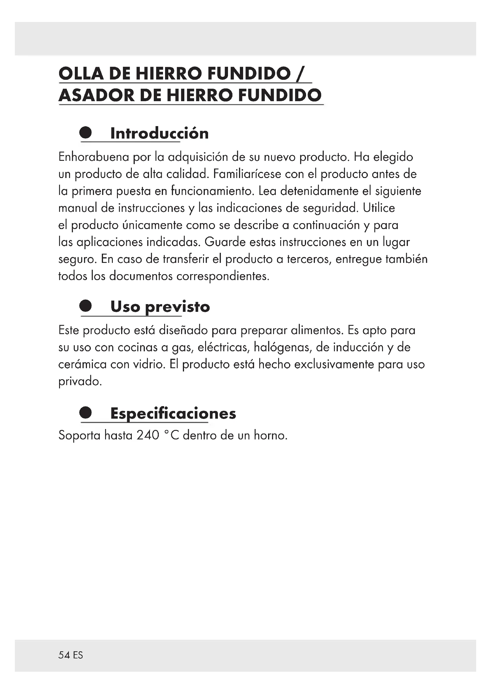 Introducción Enhorabuena por la adquisición de su nuevo producto. Ha elegido un producto de alta calidad. Familiarícese con el producto antes de la primera puesta en funcionamiento. Lea detenidamente el siguiente manual de instrucciones y las indicaciones de seguridad. Utilice el producto únicamente como se describe a continuación y para las aplicaciones indicadas. Guarde estas instrucciones en un lugar seguro. En caso de transferir el producto a terceros, entregue también todos los documentos correspondientes. Uso previsto Este producto está diseñado para preparar alimentos. Es apto para su uso con cocinas a gas, eléctricas, halógenas, de inducción y de cerámica con vidrio. El producto está hecho exclusivamente para uso privado. Especificaciones Soporta hasta 240 °C dentro de un horno.55ES Instrucciones de seguridad ¡GUARDE TODAS LAS INSTRUCCIONES DE SEGURIDAD E INSTRUCCIONES GENERALES PARA SU USO A FUTURO!