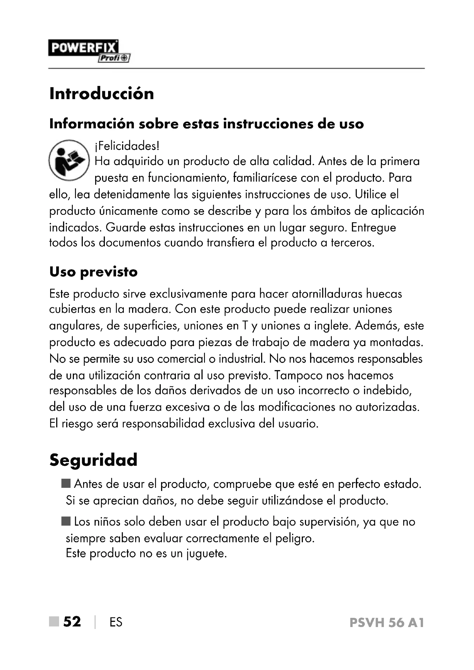 ES Introducción Información sobre estas instrucciones de uso ¡Felicidades! Ha adquirido un producto de alta calidad. Antes de la primera puesta en funcionamiento, familiarícese con el producto. Para ello, lea detenidamente las siguientes instrucciones de uso. Utilice el producto únicamente como se describe y para los ámbitos de aplicación indicados. Guarde estas instrucciones en un lugar seguro. Entregue todos los documentos cuando transfiera el producto a terceros. Uso previsto Este producto sirve exclusivamente para hacer atornilladuras huecas cubiertas en la madera. Con este producto puede realizar uniones angulares, de superficies, uniones en T y uniones a inglete. Además, este producto es adecuado para piezas de trabajo de madera ya montadas. No se permite su uso comercial o industrial. No nos hacemos responsables de una utilización contraria al uso previsto. Tampoco nos hacemos responsables de los daños derivados de un uso incorrecto o indebido, del uso de una fuerza excesiva o de las modificaciones no autorizadas. El riesgo será responsabilidad exclusiva del usuario. Seguridad ■ Antes de usar el producto, compruebe que esté en perfecto estado. Si se aprecian daños, no debe seguir utilizándose el producto. ■ Los niños solo deben usar el producto bajo supervisión, ya que no siempre saben evaluar correctamente el peligro. Este producto no es un juguete.PSVH 56 A1 ES