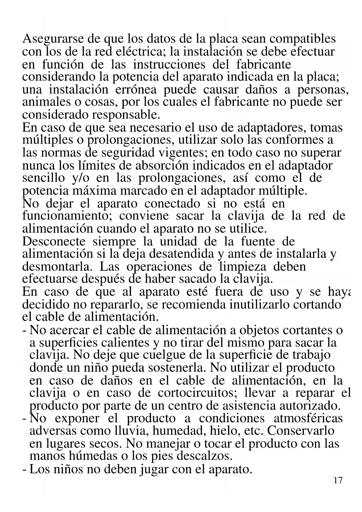 A continuación se presentan importantes indicaciones sobre la instalación, el uso y el mantenimiento. Conservar con cuidado este manual para cualquier consulta posterior; utilizar el producto solo de la manera que indica este manual de instrucciones; cualquier otro uso se considera inadecuado y peligroso; por ello el fabricante no puede ser considerado responsable en caso de que se produzcan daños derivados de usos inadecuados, erróneos o irracionales. Antes del uso asegurarse de la integridad del aparato; en caso de duda no utilizarlo y dirigirse al personal de asistencia; no dejar los elementos del embalaje (bolsas de plástico, poliestireno expandido, clavos, grapas, etc.) al alcance de los niños ya que son fuentes potenciales de peligro; además, cabe recordar que los citados elementos deben ser objeto de una recogida selectiva.17 Asegurarse de que los datos de la placa sean compatibles con los de la red eléctrica; la instalación se debe efectuar en función de las instrucciones del fabricante considerando la potencia del aparato indicada en la placa; una instalación errónea puede causar daños a personas, animales o cosas, por los cuales el fabricante no puede ser considerado responsable. En caso de que sea necesario el uso de adaptadores, tomas múltiples o prolongaciones, utilizar solo las conformes a las normas de seguridad vigentes; en todo caso no superar nunca los límites de absorción indicados en el adaptador sencillo y/o en las prolongaciones, así como el de potencia máxima marcado en el adaptador múltiple. No dejar el aparato conectado si no está en funcionamiento; conviene sacar la clavija de la red de alimentación cuando el aparato no se utilice. Desconecte siempre la unidad de la fuente de alimentación si la deja desatendida y antes de instalarla y desmontarla. Las operaciones de limpieza deben efectuarse después de haber sacado la clavija. En caso de que al aparato esté fuera de uso y se haya decidido no repararlo, se recomienda inutilizarlo cortando el cable de alimentación. - No acercar el cable de alimentación a objetos cortantes o a superficies calientes y no tirar del mismo para sacar la clavija. No deje que cuelgue de la superficie de trabajo donde un niño pueda sostenerla. No utilizar el producto en caso de daños en el cable de alimentación, en la clavija o en caso de cortocircuitos; llevar a reparar el producto por parte de un centro de asistencia autorizado. - No exponer el producto a condiciones atmosféricas adversas como lluvia, humedad, hielo, etc. Conservarlo en lugares secos. No manejar o tocar el producto con las manos húmedas o los pies descalzos. - Los niños no deben jugar con el aparato.18 - Este aparato puede ser utilizado por niños a partir de 8 años y por personas con capacidades físicas, sensoriales o mentales reducidas o con falta de experiencia o conocimiento si a dichas personas se ha asegurado una supervisión adecuada o bien si han recibido instrucciones sobre el uso seguro del aparato; las operaciones de limpieza y de mantenimiento no deben ser efectuadas por niños a no ser que tengan más de 8 años y estén supervisados. - Mantener el producto y el cable fuera del alcance de los niños menores de 8 años. - No apto para uso comercial. Solo para uso doméstico Este aparato está diseñado para uso doméstico o similares: cocinas para el personal de tiendas, oficinas u otros centros de trabajo, para clientes de hoteles, moteles, hostales y similares. En caso de avería y/o de funcionamiento anómalo no manipular el aparato. Para una posible reparación, dirigirse únicamente a un centro autorizado por el fabricante y solicitar el uso de recambios originales. El incumplimiento de lo indicado anteriormente puede comprometer la seguridad del aparato y anular las condiciones de la garantía. El aparato no está diseñado para su uso a través de temporizadores externos o mandos a distancia. Antes de cada uso, desenrolle el cable de alimentación. Utilice únicamente piezas de repuesto y accesorios originales. No someta el producto a impactos fuertes se producirán daños serios. Mantenga la unidad lejos de materiales inflamables, calor, puntos fríos y vapor.