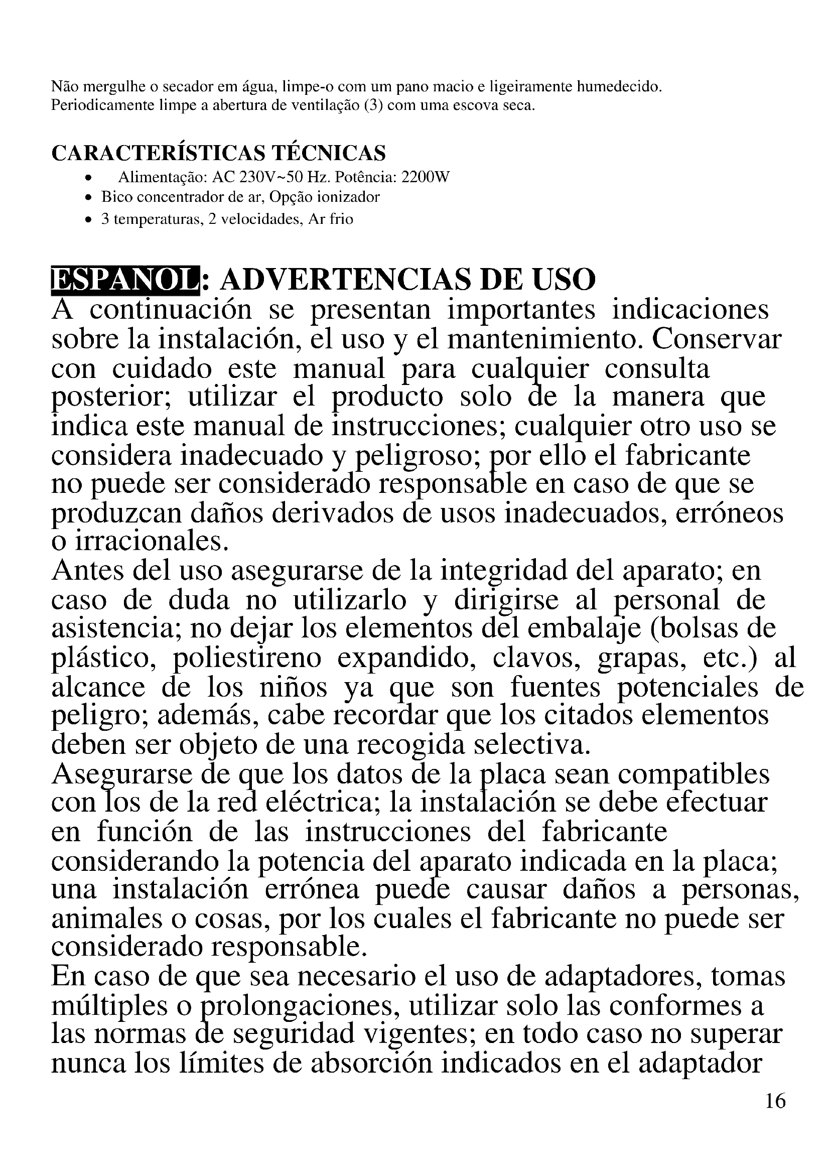 - Ajuste el control (7) a “0” y enchufe el secador - El secador dispone de dos velocidades, ajuste el botón (7) al “I” para velocidad baja y a “II” para velocidad alta. - Ajuste la temperatura del aire mediante el control (6). - El concentrador (7) se calienta muy rápidamente, cuando el secador está funcionando no lo toque. - Al final del secado ponga el control (7) a “0” - Deje que el secador se enfríe (unos 20 minutos) - Cuando el secador está completamente frío almacénelo fuera del alcance de los niños. Conmutador de control de temperatura El equipo le permite seleccionar la temperatura del aire. Con el control (6) al “0” el aire está a temperatura ambiente, al “I” está a temperatura medianamente caliente y a “II” a temperatura muy caliente. Botón “Cool-shot” El secador proporciona una corriente constante de aire caliente, presionando este botón (5) se apaga momentáneamente la resistencia de calor y el secador suministra aire a temperatura ambiente.20 Ionizador Este equipo está dotado de un aparato que desprende iones durante su utilización. Los iones reducen el tiempo de secado y evitan la electricidad electrostática en el cabello. LIMPIEZA - Desenchufe el aparato de la corriente y espere a que se haya enfriado completamente antes de comenzar la limpieza. - No sumergir el secador en agua - Utilizar un paño seco y suave para limpiarlo - Periódicamente limpie la entrada de aire (3) con un cepillo seco. CARACTERISTICAS TECNICAS - Alimentación; 230V ~50Hz. Potencia 2200W - Concentrador de air Ionizador - 3 temperaturas y 2 velocidades - Opción Cool-shot