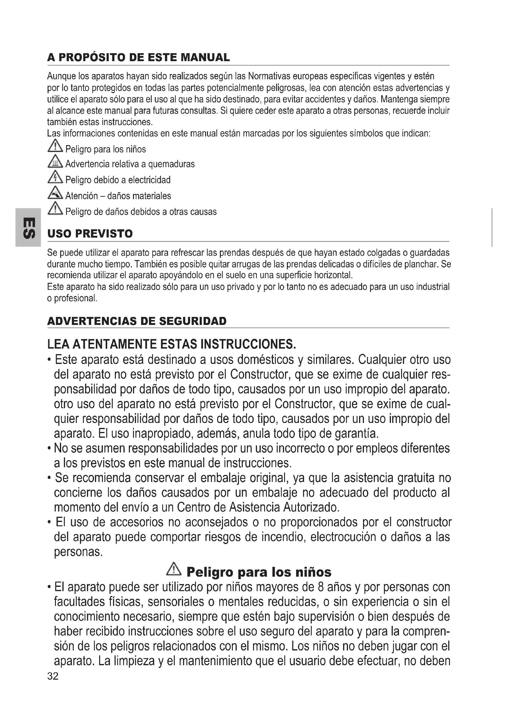 Aunque los aparatos hayan sido realizados según las Normativas europeas especicas vigentes y estén por lo tanto protegidos en todas las partes potencialmente peligrosas, lea con atención estas advertencias y utilice el aparato sólo para el uso al que ha sido destinado, para evitar accidentes y daños. Mantenga siempre al alcance este manual para futuras consultas. Si quiere ceder este aparato a otras personas, recuerde incluir también estas instrucciones. Las informaciones contenidas en este manual están marcadas por los siguientes símbolos que indican: Peligro para los niños Advertencia relativa a quemaduras Peligro debido a electricidad Atención – daños materiales Peligro de daños debidos a otras causas USO PREVISTO Se puede utilizar el aparato para refrescar las prendas después de que hayan estado colgadas o guardadas durante mucho tiempo. También es posible quitar arrugas de las prendas delicadas o difíciles de planchar. Se recomienda utilizar el aparato apoyándolo en el suelo en una supercie horizontal. Este aparato ha sido realizado sólo para un uso privado y por lo tanto no es adecuado para un uso industrial o profesional.
