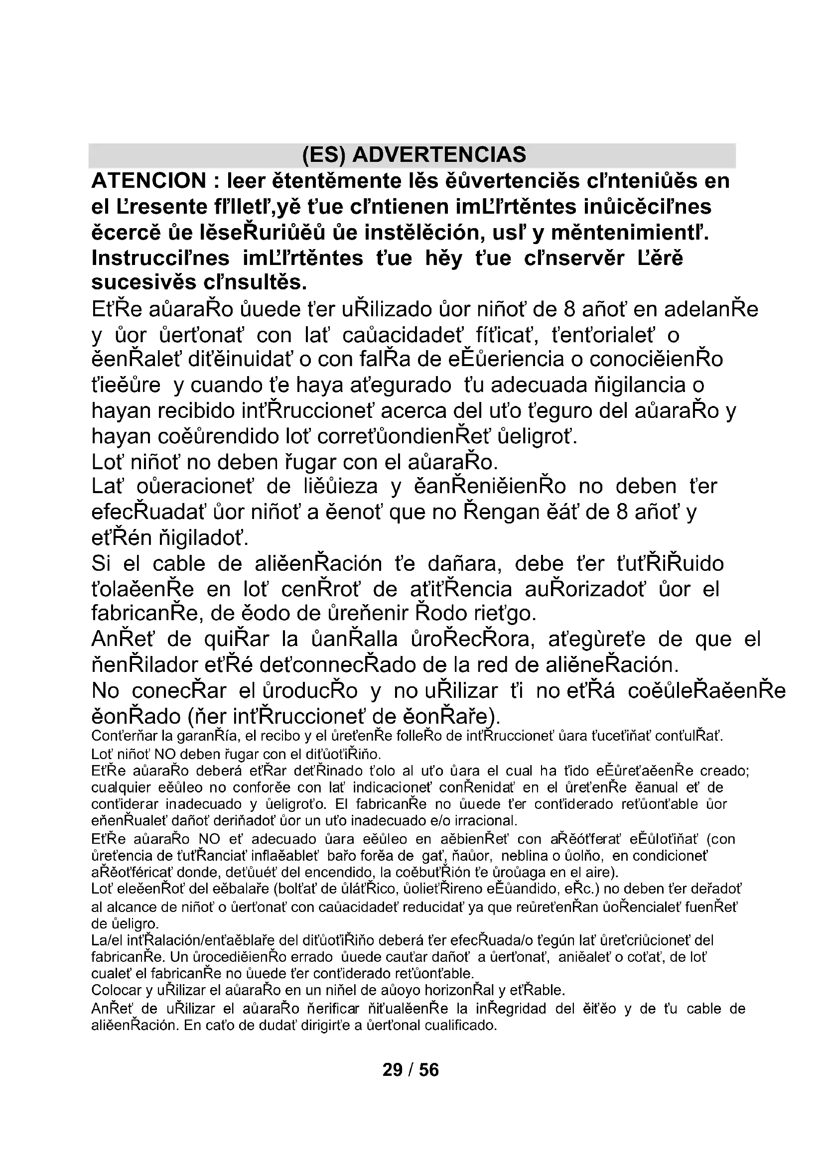 GARANTIESCHEIN Garantiebedingungen: Die Garantie dauert 24 Monate vom Einkaufsdatum. Dieser Garantieschein hat nur Gültigkeit, wenn er ordnungsgemäß ausgefüllt und zusammen mit dem Kassenzettel vorgelegt wird. Die Garantie umfaßt den Ersatz oder die Reparatur aller Komponenten des Gerätes im Falle von Herstellungsfehlern. Das Gerät wird ausschließlich nur von einem unserer autorisierten Kundendienststellen zurückgenommen. Außerdem garantieren wir für fachgerechte Dienstleistung (gegen Bezahlung) auch außerhalb der Garantiezeit. Die Herstellungsfirma lehnt jede Verantwortung hinsichtlich Schäden an Personen, Tieren oder Gegenständen ab, die durch unsachgemäße Benutzung des Geräts oder Nichtbefolgen der beiliegenden Bedienungsanleitung entstehen. Einschränkungen: Der Garantieanspruch bzw. unsere Verantwortlichkeit erlischt, wenn das Gerät: - von nicht autorisierten Personen demontiert wurde; - in unsachgemäßer oder unnormaler Weise zum Einsatz kam, aufbewahrt oder transportiert wurde. Weiterhin sind von der Garantie alle äußeren Abnutzungserscheinungen am Gerät, die die Funktion des Gerätes nicht beeinträchtigen, ausgeschlossen. Sollten, trotz der Sorgfalt bei der Auswahl der Materialien und trotz der Bemühungen bei der Realisierung des Produktes, das Sie erst gerade erworben haben, Defekte gefunden werden oder sollten Sie irgendwelche Informationen benötigen, so empfehlen wir Ihnen, sich an den für Ihr Gebiet zuständigen Fachhändler zu wenden.29 / 56 (ES) ADVERTENCIAS ATENCION : leer atentamente las advertencias contenidas en el presente folleto,ya que contienen importantes indicaciones acerca de laseguridad de instalación, uso y mantenimiento. Instrucciones importantes que hay que conservar para sucesivas consultas. Este aparato puede ser utilizado por niños de 8 años en adelante y por personas con las capacidades físicas, sensoriales o mentales disminuidas o con falta de experiencia o conocimiento siempre y cuando se haya asegurado su adecuada vigilancia o hayan recibido instrucciones acerca del uso seguro del aparato y hayan comprendido los correspondientes peligros. Los niños no deben jugar con el aparato. Las operaciones de limpieza y mantenimiento no deben ser efectuadas por niños a menos que no tengan más de 8 años y estén vigilados. Si el cable de alimentación se dañara, debe ser sustituido solamente en los centros de asistencia autorizados por el fabricante, de modo de prevenir todo riesgo. Antes de quitar la pantalla protectora, asegùrese de que el ventilador esté desconnectado de la red de alimnetación. No conectar el producto y no utilizar si no está completamente montado (ver instrucciones de montaje). Conservar la garantía, el recibo y el presente folleto de instrucciones para sucesivas consultas. Los niños NO deben jugar con el dispositivo. Este aparato deberá estar destinado solo al uso para el cual ha sido expresamente creado; cualquier empleo no conforme con las indicaciones contenidas en el presente manual es de considerar inadecuado y peligroso. El fabricante no puede ser considerado responsable por eventuales daños derivados por un uso inadecuado e/o irracional. Este aparato NO es adecuado para empleo en ambientes con atmósferas explosivas (con presencia de sustancias inflamables bajo forma de gas, vapor, neblina o polvo, en condiciones atmosféricas donde, después del encendido, la combustión se propaga en el aire). Los elementos del embalaje (bolsas de plástico, poliestireno expandido, etc.) no deben ser dejados al alcance de niños o personas con capacidades reducidas ya que representan potenciales fuentes de peligro. La/el instalación/ensamblaje del dispositivo deberá ser efectuada/o según las prescripciones del fabricante. Un procedimiento errado puede causar daños a personas, animales o cosas, de los cuales el fabricante no puede ser considerado responsable. Colocar y utilizar el aparato en un nivel de apoyo horizontal y estable. Antes de utilizar el aparato verificar visualmente la integridad del mismo y de su cable de alimentación. En caso de dudas dirigirse a personal cualificado.30 / 56 Antes de alimentar el aparato asegurarse de que sus datos de placa (tensión y frecuencia) correspondan con los de la red de distribución eléctrica y que la toma sea adecuada al terminal del cable del cual que está dotado el aparato. Verificar que la instalación eléctrica utilizada para la alimentación esté dotada de las protecciones adecuadas de acuerdo con las leyes vigentes. NO alimentar el aparato mediante tomas múltiples. Evitar si es posible el empleo de adaptadores y/o alargadores; en caso de que su empleo fuera necesario utilizar exclusivamente material conforme con las normas vigentes de seguridad y en el respeto de los parámetros eléctricos de los adaptadores en cuestión. El aparato no debe ser encendido mediante temporizadores externos y/u otros dispositivos de control remoto no expresamente previstos por el presente manual. NO utilizar ni conservar el dispositivo cerca de fuentes de calor localizadas (calentadores, estufas etc.). NO sumergir el aparato en agua u otros líquidos; en caso de caída accidentalmente en agua NO tratar de recuperarlo sino primero que nada desconectar inmediatamente el cable de alimentación de la toma eléctrica. Utilizando el aparato por primera vez, asegurarse de haber quitado la etiqueta o la hoja de protección que impida el correcto funcionamiento. Conectar y desconectar el cable de alimentación con las manos secas y cogiéndolo firmemente. Antes de conectar el enchufe en la toma de corriente asegurarse de que el botón de encendido del aparato esté en posición “OFF” (apagado). Desenrollar siempre totalmente el cable de alimentación con el fin de evitar recalentamientos, evitar en todo caso tenderlo (no halarlo, tironearlo, ni utilizarlo para arrastrar el dispositivo donde está conectado). Evitar colocar el cable de alimentación en superficies abrasivas