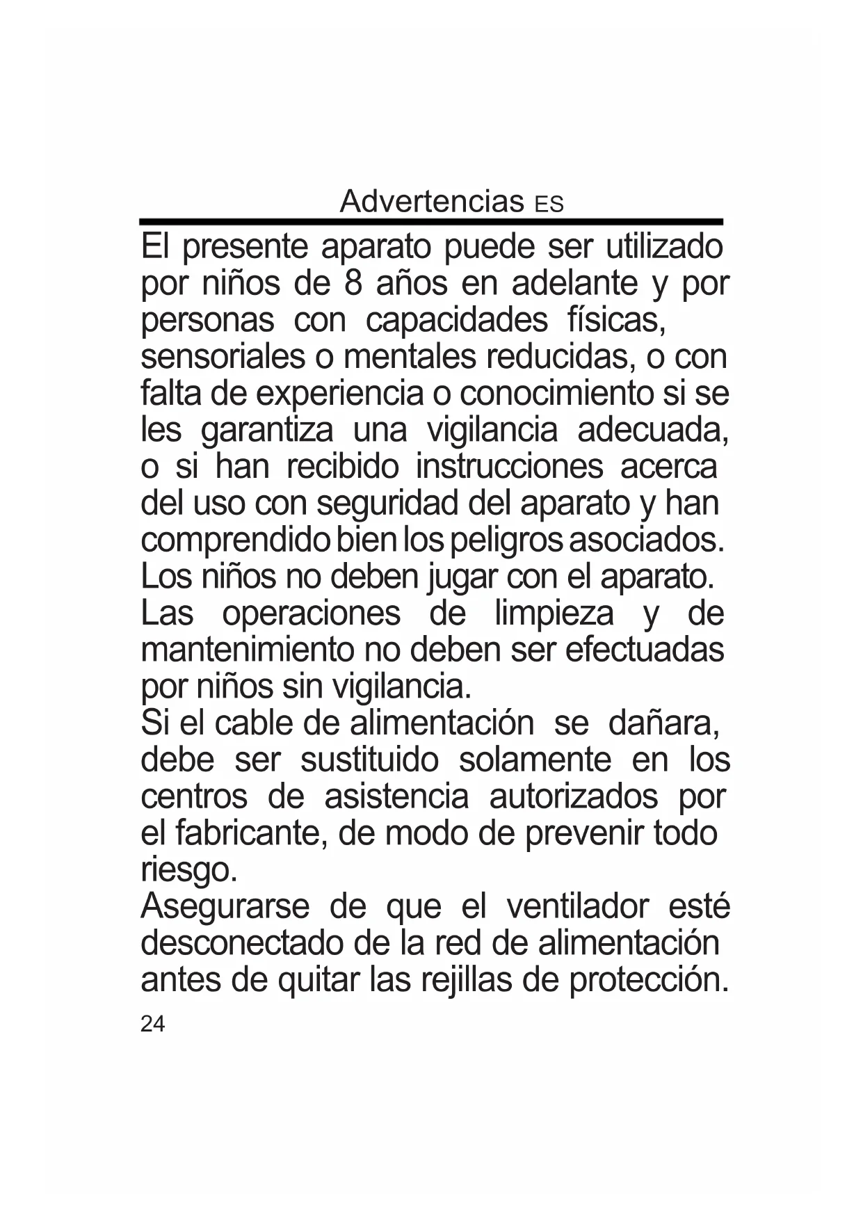 Buttons A. O B. On/Speed C. Mode D. Timer E. Swing Batteries Remote control is supplied without batteries; before use remote control open the batteries holder placed on the back of remote control and insert 2 batteries LR03 1,5V AAA. To remove batteries, open the batteries holder placed on the back of the remote control, by sliding the cover to the outwards. OFF Button (A): Press this button when the unit is on, to turn it o. ON/SPEED Button (B): Press this button when the unit is o to turn it on. Press this button when unit is on to select the desired speed: low speed (“LOW” indicator light”), medium speed (“MED” indicator light) or high speed (“HIG” indicator light). MODE Button (C): Press this button when unit is on to select the desired mode: normal (“NOR” indicator light), natural (“NAT” indicator light) or sleeping mode (“SLP” indicator light).21 Maintenance Before carrying out the regular cleaning operations turn o the fan and unplug it. Ensure that the fan is switched o from the supply mains before removing the guard. For external cleaning use a soft and dry cloth. DO NOT dip the device in water, or splash it with any other liquids. DO NOT use solvents or any other chemical products for cleaning it. Reinstall the guard after cleaning and before connecting the plug tot he mains. When you do not use it, after cleaning it, store the fan in a dry place. TIMER Button (D): When the unit is operating, you can set the timer to switch the fan o automatically after the set time. Press this button repeatedly to select the desired time period in half hours increments from 0,5 hours to 7,5 hours. The related indicator light (0,5H, 1H, 2H, 4H) will illuminate on the control panel. When all the indicators light are o means that timer is not setted and the unit will continuously work until you switch o manually the unit. SWING Button (E): Press this button when unit is on to activate the automatic oscillation from left to right. To deactivate the automatic oscillation press again this button. VERTICAL SLOPE: You can vertically point the front of the fan choosing the desired angle. It is sucient to move the front of the fan up or down according to the desired slope.22 BATTERIES - Remove the batteries from the appliance before its disposal. Do not dispose the batteries with domestic waste. The batteries must be disposed of in the appropriate containers or in the specic collecting centre. Suitable segregated collection helps prevent damage to the environment and to human health. To remove batteries, refer to Instructions for use. DISPOSAL USER INFORMATION “Implementation of Directive 2012/19/EU on Waste Electrical and Electronic Equipment (WEEE)”, pertaining to reduced use of hazardous substances in electrical and electronic equipment, as well as to waste disposal. The symbol of the crossed-out wheelie bin on the equipment or on its packaging indicates that the product must be disposed of separately from other waste at the end of its service life. The user must therefore take the dismissed equipment to suitable separate collection centres for electrical and electronic waste. For more details, please contact the appropriate local authority. Suitable segregated collection of the equipment for subsequent recycling, treatment or environmentally- friendly disposal helps prevent damage to the environment and to human health, and encourages the re-use and/or recycling of the materials that make up the equipment. Abusive disposal of the product by the user shall result in the application of administrative nes in accordance with the laws in force. User Information23 GUARANTEE Terms and Conditions The guarantee is valid for 24 months. This guarantee applies only if it has been duly lled in and is submitted with the receipt showing the date of purchase. The guarantee covers the replacement or repair of parts making up the appliance which were faulty at source due to manufacturing faults. After the guarantee has expired, the appliance will be repaired against payment. The manufacturer declines any responsibility for damage to persons, animals or property due to misuse of the appliance and failure to observe the directions contained in the instructions. Limits All rights under this guarantee and any responsibility on our part will be voided if the appliance has been: - mishandled by unauthorized persons - improperly used, stored or transported. The guarantee does not cover damage to the outward appearance or any other that does not prevent regular operation. If any faults should be found despite the care taken in selecting the materials and in creating the product, or if any information or advice are required, please contact your local dealer.24 El presente aparato puede ser utilizado por niños de 8 años en adelante y por personas con capacidades físicas, sensoriales o mentales reducidas, o con falta de experiencia o conocimiento si se les garantiza una vigilancia adecuada, o si han recibido instrucciones acerca del uso con seguridad del aparato y han comprendido bien los peligros asociados. Los niños no deben jugar con el aparato. Las operaciones de limpieza y de mantenimiento no deben ser efectuadas por niños sin vigilancia. Si el cable de alimentación se dañara, debe ser sustituido solamente en los centros de asistencia autorizados por el fabricante, de modo de prevenir todo riesgo. Asegurarse de que el ventilador esté desconectado de la red de alimentación antes de quitar las rejillas de protección. Advertencias ES25 No conectar el producto y no utilizar si no está completamente montado (ver instrucciones de montaje). ATENCIÓN: leer atentamente el presente manual ya que contiene instrucciones importantes para la seguridad durante la instalación, uso y mantenimiento. Instrucciones importantes de conservar para futuras referencias. Los niños NO deben jugar con el dispositivo. Este aparato deberá estar destinado solo al uso para el cual ha sido expresamente creado; 