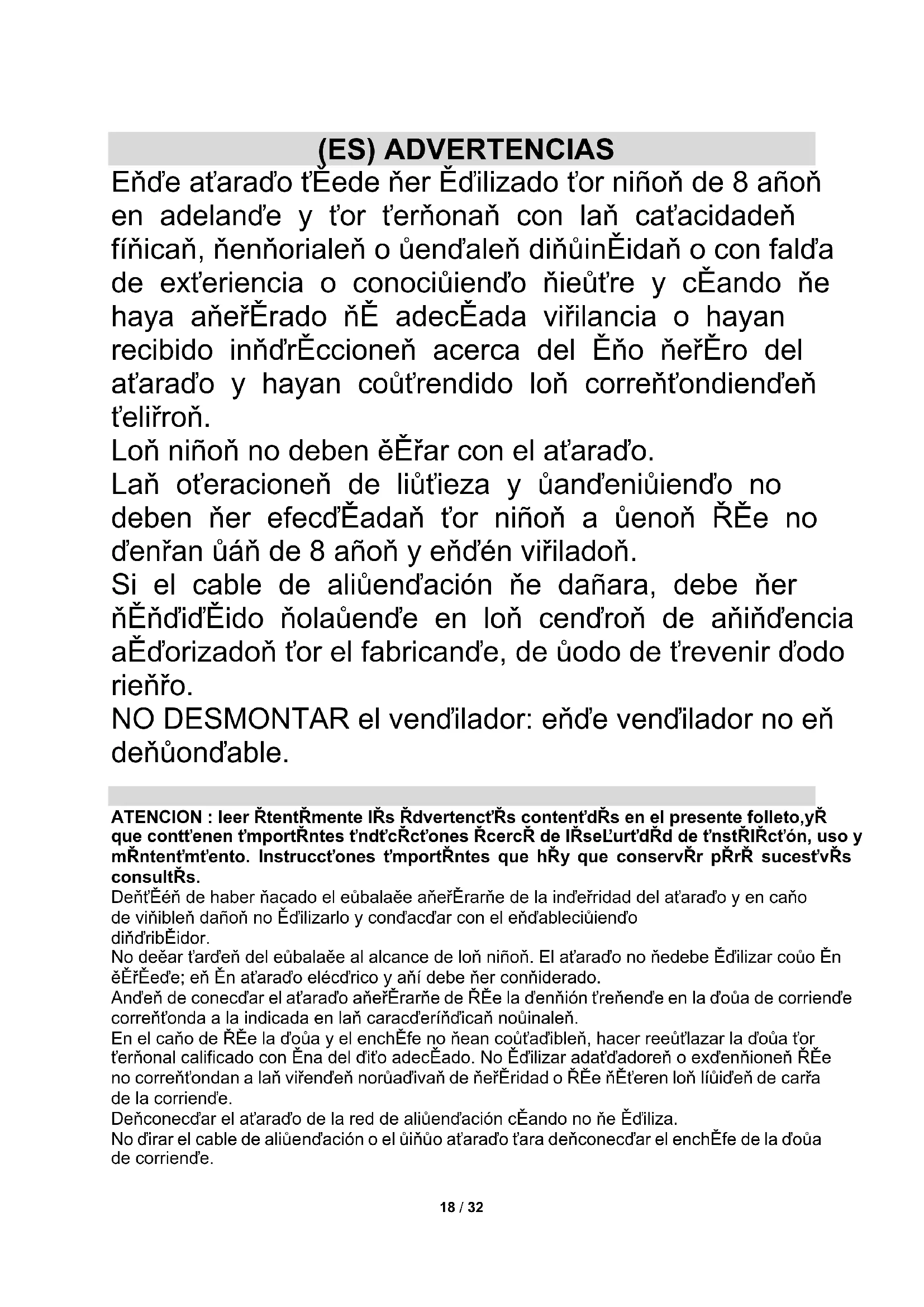 (ES) MANTENIMIENTO Antes de realizar las operaciones normales de limpieza apagar el ventilador y desconectarlo de la red de alimentación eléctrica. NO DESMONTAR el ventilador: este ventilador no es desmontable. Para la limpieza externa utilizar un paño suave y seco. NO sumergir el ventilador en agua, ni rociarlo con líquidos de ningún tipo. NO utilizar solventes u otros productos químicos para la limpieza. Cuando no es utilizado, después de la limpieza conservar el ventilador en un lugar seco.21 / 32