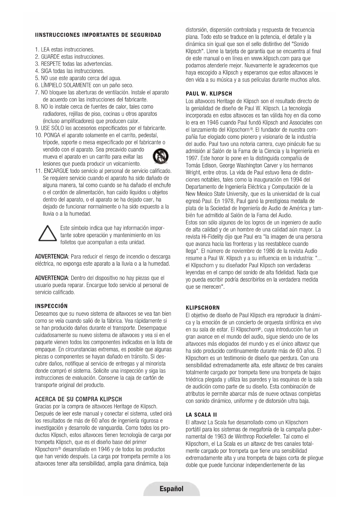 Gracias por la compra de altavoces Heritage de Klipsch. Después de leer este manual y conectar el sistema, usted oirá los resultados de más de 60 años de ingeniería rigurosa e investigación y desarrollo de vanguardia. Como todos los pro- ductos Klipsch, estos altavoces tienen tecnología de carga por trompeta Klipsch, que es el diseño base del primer Klipschorn