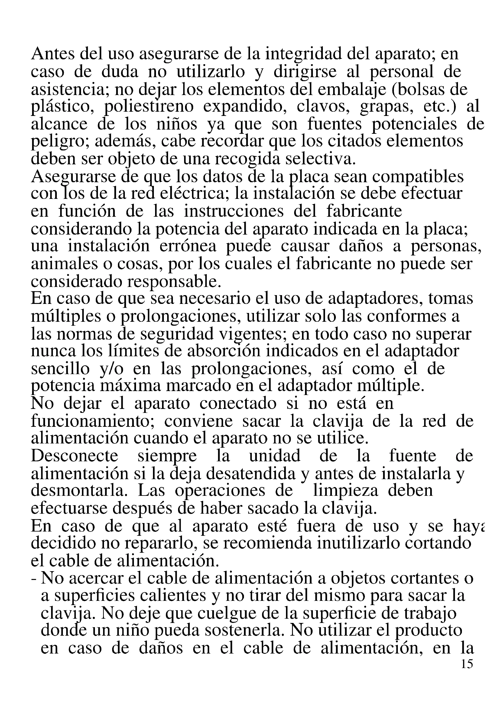 A continuación se presentan importantes indicaciones sobre la instalación, el uso y el mantenimiento. Conservar con cuidado este manual para cualquier consulta posterior; utilizar el producto solo de la manera que indica este manual de instrucciones; cualquier otro uso se considera inadecuado y peligroso; por ello el fabricante no puede ser considerado responsable en caso de que se produzcan daños derivados de usos inadecuados, erróneos o irracionales.15 Antes del uso asegurarse de la integridad del aparato; en caso de duda no utilizarlo y dirigirse al personal de asistencia; no dejar los elementos del embalaje (bolsas de plástico, poliestireno expandido, clavos, grapas, etc.) al alcance de los niños ya que son fuentes potenciales de peligro; además, cabe recordar que los citados elementos deben ser objeto de una recogida selectiva. Asegurarse de que los datos de la placa sean compatibles con los de la red eléctrica; la instalación se debe efectuar en función de las instrucciones del fabricante considerando la potencia del aparato indicada en la placa; una instalación errónea puede causar daños a personas, animales o cosas, por los cuales el fabricante no puede ser considerado responsable. En caso de que sea necesario el uso de adaptadores, tomas múltiples o prolongaciones, utilizar solo las conformes a las normas de seguridad vigentes; en todo caso no superar nunca los límites de absorción indicados en el adaptador sencillo y/o en las prolongaciones, así como el de potencia máxima marcado en el adaptador múltiple. No dejar el aparato conectado si no está en funcionamiento; conviene sacar la clavija de la red de alimentación cuando el aparato no se utilice. Desconecte siempre la unidad de la fuente de alimentación si la deja desatendida y antes de instalarla y desmontarla. Las operaciones de limpieza deben efectuarse después de haber sacado la clavija. En caso de que al aparato esté fuera de uso y se haya decidido no repararlo, se recomienda inutilizarlo cortando el cable de alimentación. - No acercar el cable de alimentación a objetos cortantes o a superficies calientes y no tirar del mismo para sacar la clavija. No deje que cuelgue de la superficie de trabajo donde un niño pueda sostenerla. No utilizar el producto en caso de daños en el cable de alimentación, en la16 clavija o en caso de cortocircuitos; llevar a reparar el producto por parte de un centro de asistencia autorizado. - No exponer el producto a condiciones atmosféricas adversas como lluvia, humedad, hielo, etc. Conservarlo en lugares secos. No manejar o tocar el producto con las manos húmedas o los pies descalzos. - Este aparato puede ser utilizado por niños a partir de 8 años y por personas con capacidades físicas, sensoriales o mentales reducidas o con falta de experiencia o conocimiento si a dichas personas se ha asegurado una supervisión adecuada o bien si han recibido instrucciones sobre el uso seguro del aparato; las operaciones de limpieza y de mantenimiento no deben ser efectuadas por niños a no ser que tengan más de 8 años y estén supervisados. - Los niños no deben jugar con el aparato. - Mantener el producto y el cable fuera del alcance de los niños menores de 8 años. - No apto para uso comercial. Solo para uso doméstico En caso de avería y/o de funcionamiento anómalo no manipular el aparato. Para una posible reparación, dirigirse únicamente a un centro autorizado por el fabricante y solicitar el uso de recambios originales. El incumplimiento de lo indicado anteriormente puede comprometer la seguridad del aparato y anular las condiciones de la garantía. ATENCIÓN: el producto tiene una función de calentamiento. Las superficies pueden desarrollar altas temperaturas. La percepción de la temperatura es distinta para cada persona, utilizar el aparato con cautela. Tocar solo las superficies diseñadas para ser tocadas, y usar agarradores o guantes de cocina. Este aparato está diseñado para uso doméstico o similares: cocinas para el personal de tiendas, oficinas u17 otros centros de trabajo, para clientes de hoteles, moteles, hostales y similares. El aparato no está diseñado para su uso a través de temporizadores externos o mandos a distancia. Antes de cada uso, desenrolle el cable de alimentación. Utilice únicamente piezas de repuesto y accesorios originales. No someta el producto a impactos fuertes se producirán daños serios.