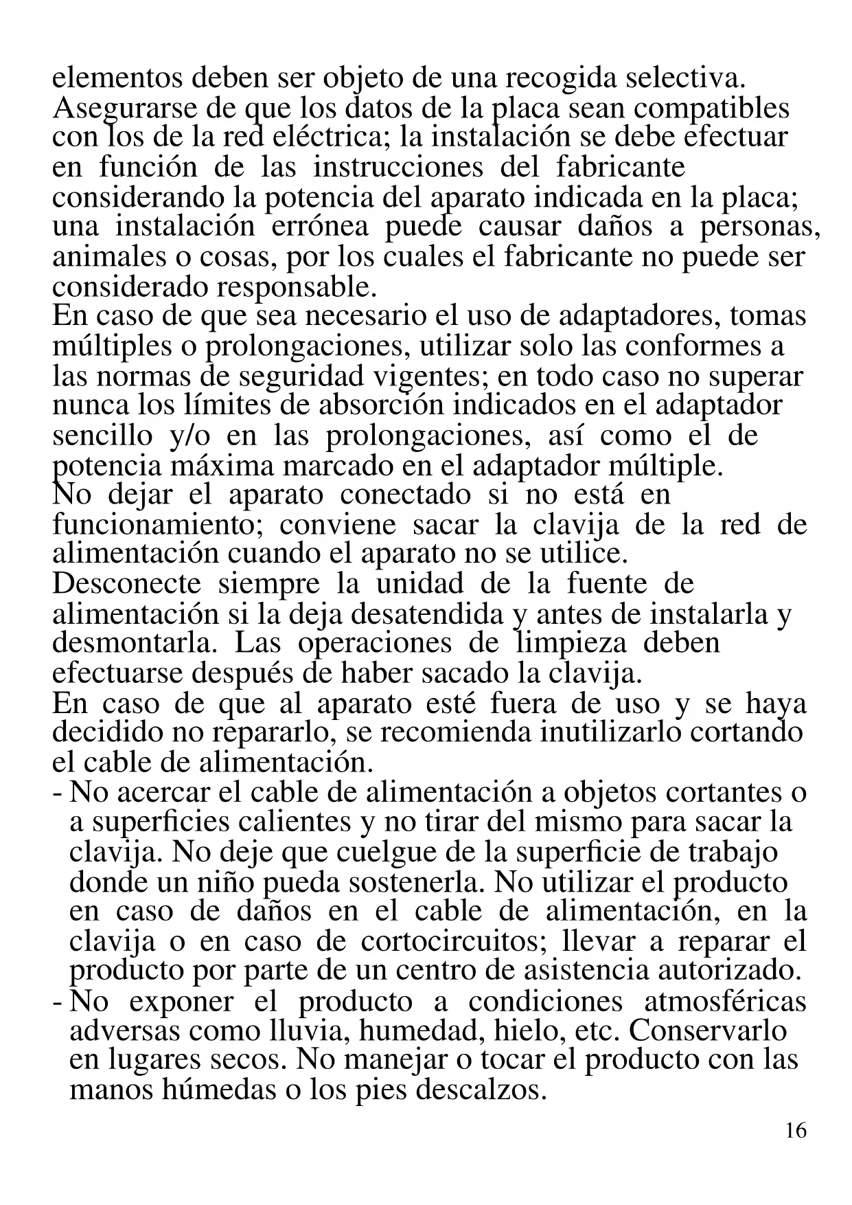A continuación se presentan importantes indicaciones sobre la instalación, el uso y el mantenimiento. Conservar con cuidado este manual para cualquier consulta posterior; utilizar el producto solo de la manera que indica este manual de instrucciones; cualquier otro uso se considera inadecuado y peligroso; por ello el fabricante no puede ser considerado responsable en caso de que se produzcan daños derivados de usos inadecuados, erróneos o irracionales. Antes del uso asegurarse de la integridad del aparato; en caso de duda no utilizarlo y dirigirse al personal de asistencia; no dejar los elementos del embalaje (bolsas de plástico, poliestireno expandido, clavos, grapas, etc.) al alcance de los niños ya que son fuentes potenciales de peligro; además, cabe recordar que los citados16 elementos deben ser objeto de una recogida selectiva. Asegurarse de que los datos de la placa sean compatibles con los de la red eléctrica; la instalación se debe efectuar en función de las instrucciones del fabricante considerando la potencia del aparato indicada en la placa; una instalación errónea puede causar daños a personas, animales o cosas, por los cuales el fabricante no puede ser considerado responsable. En caso de que sea necesario el uso de adaptadores, tomas múltiples o prolongaciones, utilizar solo las conformes a las normas de seguridad vigentes; en todo caso no superar nunca los límites de absorción indicados en el adaptador sencillo y/o en las prolongaciones, así como el de potencia máxima marcado en el adaptador múltiple. No dejar el aparato conectado si no está en funcionamiento; conviene sacar la clavija de la red de alimentación cuando el aparato no se utilice. Desconecte siempre la unidad de la fuente de alimentación si la deja desatendida y antes de instalarla y desmontarla. Las operaciones de limpieza deben efectuarse después de haber sacado la clavija. En caso de que al aparato esté fuera de uso y se haya decidido no repararlo, se recomienda inutilizarlo cortando el cable de alimentación. - No acercar el cable de alimentación a objetos cortantes o a superficies calientes y no tirar del mismo para sacar la clavija. No deje que cuelgue de la superficie de trabajo donde un niño pueda sostenerla. No utilizar el producto en caso de daños en el cable de alimentación, en la clavija o en caso de cortocircuitos; llevar a reparar el producto por parte de un centro de asistencia autorizado. - No exponer el producto a condiciones atmosféricas adversas como lluvia, humedad, hielo, etc. Conservarlo en lugares secos. No manejar o tocar el producto con las manos húmedas o los pies descalzos.17 - Los niños no deben jugar con el aparato. - Este aparato puede ser utilizado por niños a partir de 8 años y por personas con capacidades físicas, sensoriales o mentales reducidas o con falta de experiencia o conocimiento si a dichas personas se ha asegurado una supervisión adecuada o bien si han recibido instrucciones sobre el uso seguro del aparato; las operaciones de limpieza y de mantenimiento no deben ser efectuadas por niños a no ser que tengan más de 8 años y estén supervisados. - Mantener el producto y el cable fuera del alcance de los niños menores de 8 años. - No apto para uso comercial. Solo para uso doméstico En caso de avería y/o de funcionamiento anómalo no manipular el aparato. Para una posible reparación, dirigirse únicamente a un centro autorizado por el fabricante y solicitar el uso de recambios originales. El incumplimiento de lo indicado anteriormente puede comprometer la seguridad del aparato y anular las condiciones de la garantía. ATENCIÓN: el producto tiene una función de calentamiento. Las superficies pueden desarrollar altas temperaturas. La percepción de la temperatura es distinta para cada persona, utilizar el aparato con cautela. Tocar solo las superficies diseñadas para ser tocadas, y usar agarradores o guantes de cocina. Este aparato está diseñado para uso doméstico o similares: cocinas para el personal de tiendas, oficinas u otros centros de trabajo, para clientes de hoteles, moteles, hostales y similares. El aparato no está diseñado para su uso a través de temporizadores externos o mandos a distancia. Antes de cada uso, desenrolle el cable de alimentación. Utilice únicamente piezas de repuesto y accesorios originales. No someta el producto a impactos fuertes se18 producirán daños serios. Mantenga la unidad lejos de materiales inflamables, calor, puntos fríos y vapor.