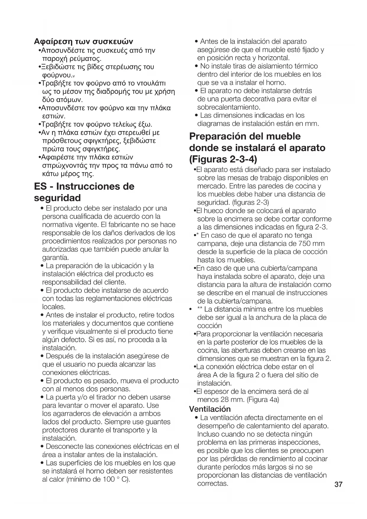 - Entre la superficie inferior de la cocina y la pared superior del horno se debe dejar una distancia mínima de 15 mm ( Figura 4b) a fin de proporcionar una ventilación adecuada. Asimismo, en la parte inferior del mueble se dejará una sección transversal con las dimensiones de 35x500 mm, donde se coloca el horno. (Figura 2) Instalación del aparato Conectar el aparato a la red eléctrica