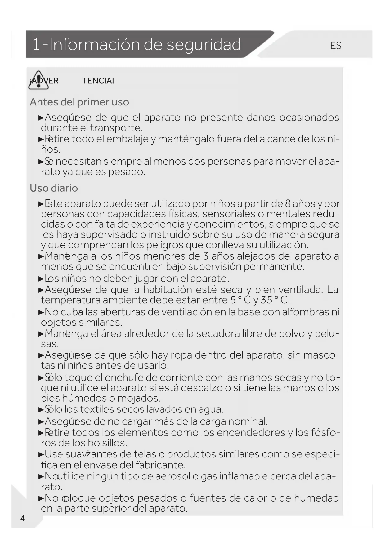¡ADVER TENCIA! Antes del primer uso ▶ Asegúr ese de que el aparato no presente daños ocasionados durante el transporte. ▶ R etire todo el embalaje y manténgalo fuera del alcance de los ni- ños. ▶ S e necesitan siempre al menos dos personas para mover el apa- rato ya que es pesado. Uso diario ▶ E ste aparato puede ser utilizado por niños a partir de 8 años y por personas con capacidades físicas, sensoriales o mentales redu- cidas o con falta de experiencia y conocimientos, siempre que se les haya supervisado o instruido sobre su uso de manera segura y que comprendan los peligros que conlleva su utilización. ▶ Mant enga a los niños menores de 3 años alejados del aparato a menos que se encuentren bajo supervisión permanente. ▶ L os niños no deben jugar con el aparato. ▶ Asegúr ese de que la habitación esté seca y bien ventilada. La temperatura ambiente debe estar entre 5 ° C y 35 ° C. ▶ No cubr a las aberturas de ventilación en la base con alfombras ni objetos similares. ▶ Mant enga el área alrededor de la secadora libre de polvo y pelu- sas. ▶ Asegúr ese de que sólo hay ropa dentro del aparato, sin masco- tas ni niños antes de usarlo. ▶ S ólo toque el enchufe de corriente con las manos secas y no to- que ni utilice el aparato si está descalzo o si tiene las manos o los pies húmedos o mojados. ▶ S ólo los textiles secos lavados en agua. ▶ Asegúr ese de no cargar más de la carga nominal. ▶ R etire todos los elementos como los encendedores y los fósfo- ros de los bolsillos. ▶ Use suavi zantes de telas o productos similares como se especi- ca en el envase del fabricante. ▶ No utilice ningún tipo de aerosol o gas inamable cerca del apa- rato. ▶ No c oloque objetos pesados o fuentes de calor o de humedad en la parte superior del aparato.ES 1-Inf ormación de seguridad