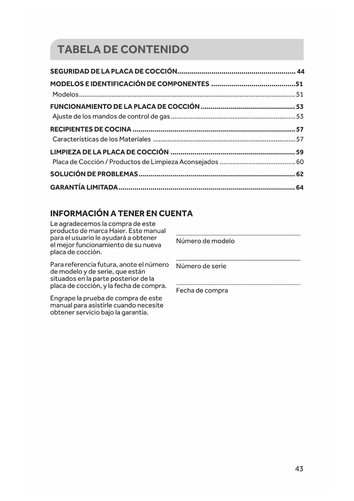 Le agradecemos la compra de este producto de marca Haier. Este manual para el usuario le ayudará a obtener el mejor funcionamiento de su nueva placa de cocción. Para referencia futura, anote el número de modelo y de serie, que están situados en la parte posterior de la placa de cocción, y la fecha de compra. Engrape la prueba de compra de este manual para asistirle cuando necesite obtener servicio bajo la garantía.