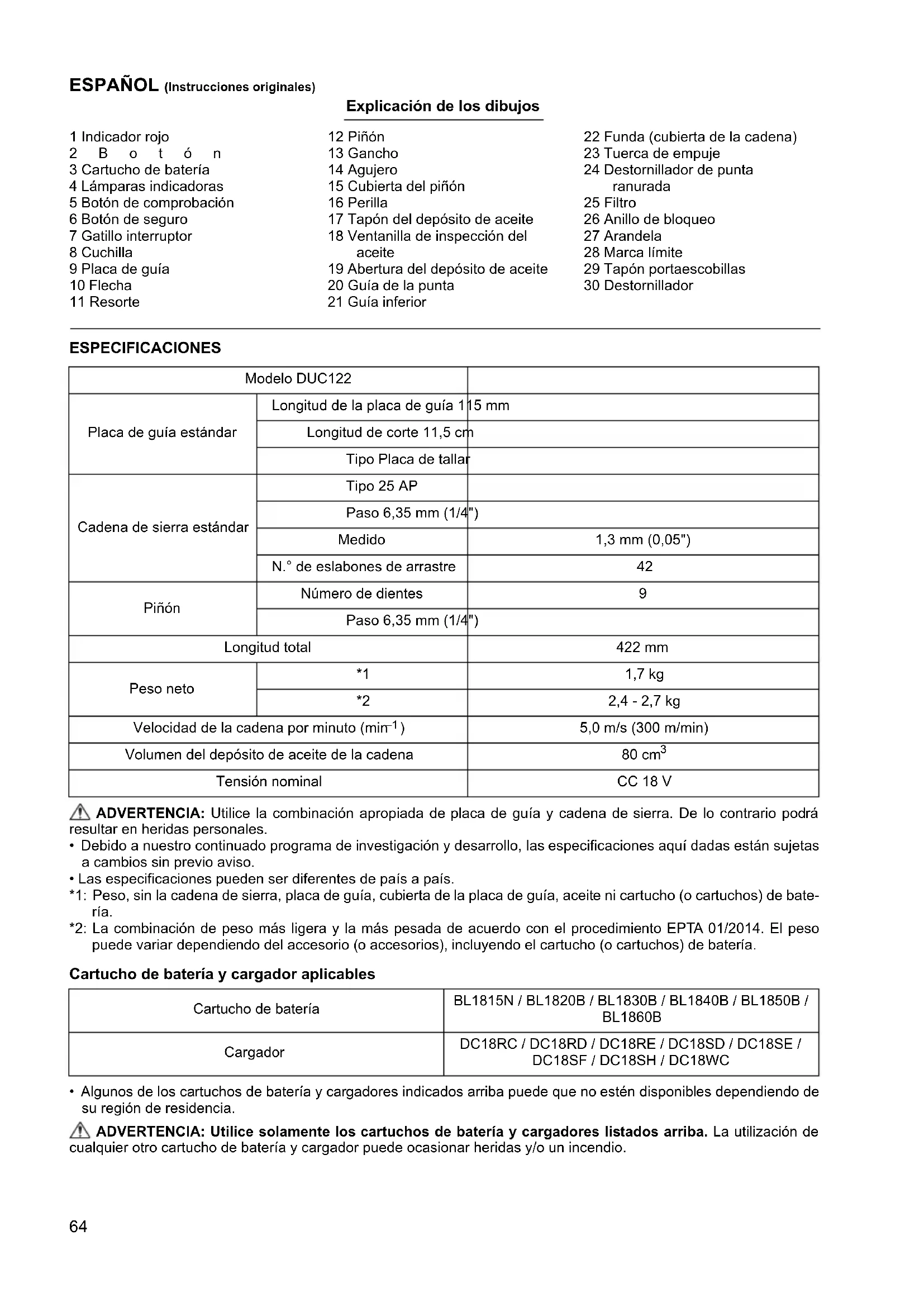 - Algunos de los cartuchos de batería y cargadores indicados arriba puede que no estén disponibles dependiendo de su región de residencia. ADVERTENCIA: Utilice solamente los cartuchos de batería y cargadores listados arriba. La utilización de cualquier otro cartucho de batería y cargador puede ocasionar heridas y/o un incendio. Modelo DUC122 Placa de guía estándar Longitud de la placa de guía 115 mm Longitud de corte 11,5 cm Tipo Placa de tallar Cadena de sierra estándar Tipo 25 AP Paso 6,35 mm (1/4") Medido 1,3 mm (0,05") N.° de eslabones de arrastre 42 Piñón Número de dientes 9 Paso 6,35 mm (1/4") Longitud total 422 mm Peso neto *1 1,7 kg *2 2,4 - 2,7 kg Velocidad de la cadena por minuto (min